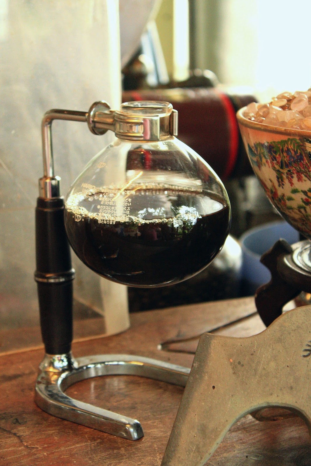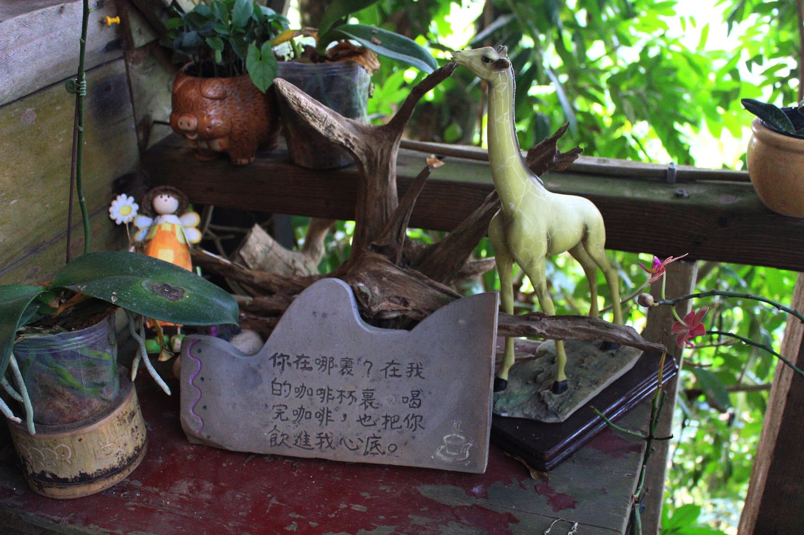 櫃台旁陶片製咖啡小語,