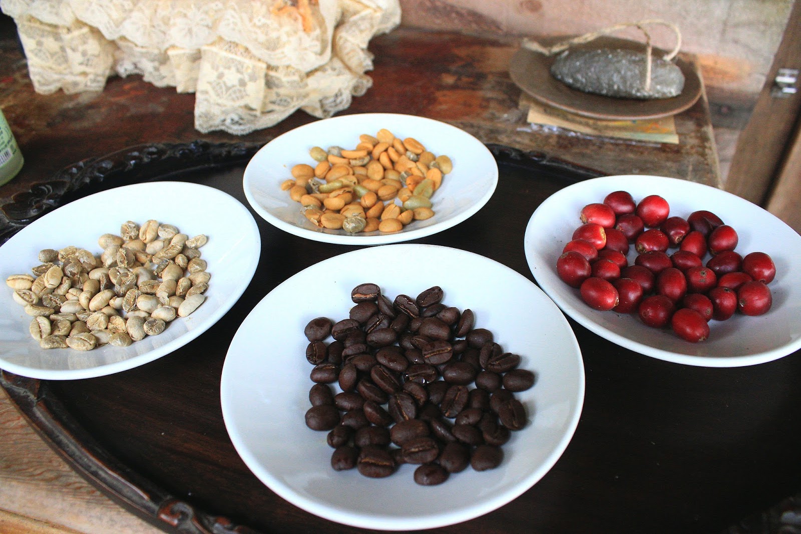 櫃檯旁的盤子裡擺著成熟的咖啡果實(紅)、去掉果肉的生咖啡豆(黃)、乾燥過咖啡豆俗稱臭豆(白)、烘焙過咖啡豆(黑褐),讓你清楚看到各個階段,