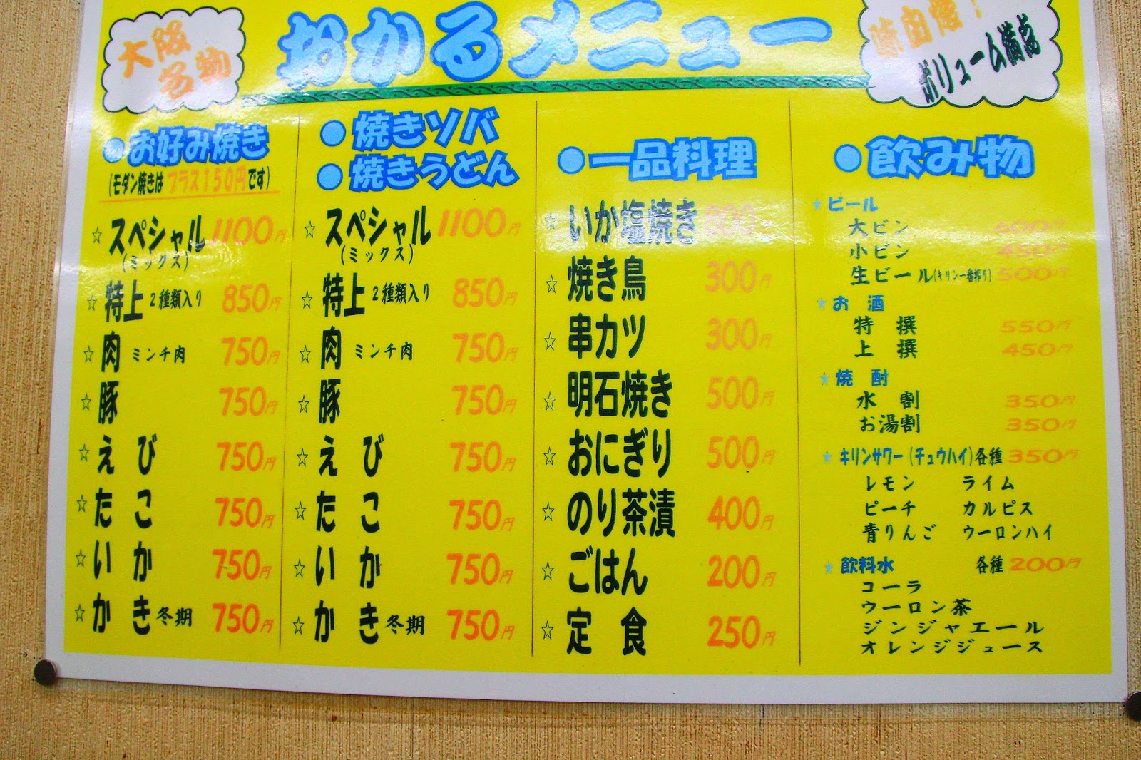 再來最重要的就是點餐啦!牆上的菜單是日文可是看不懂怎麼辦勒!沒關係!店裡有準備英文的菜單所以不用擔心,菜單大略分為幾大項(由左而右)大阪燒、蕎麥燒、單點料理、飲料,大阪燒跟蕎麥燒下面是要加的料,我們點了第一個綜合大阪燒跟豬肉蕎麥燒,