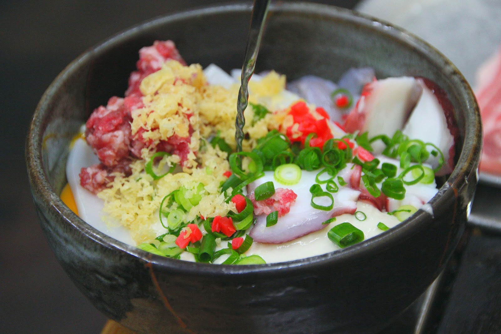 裡面有調味過的麵糊(有加山藥泥)、高麗菜絲、豬絞肉、蛋、蝦子、章魚切片、花枝塊、紅薑碎、麵酥、蔥花,最後還有兩大片的培根真的超多料的,
