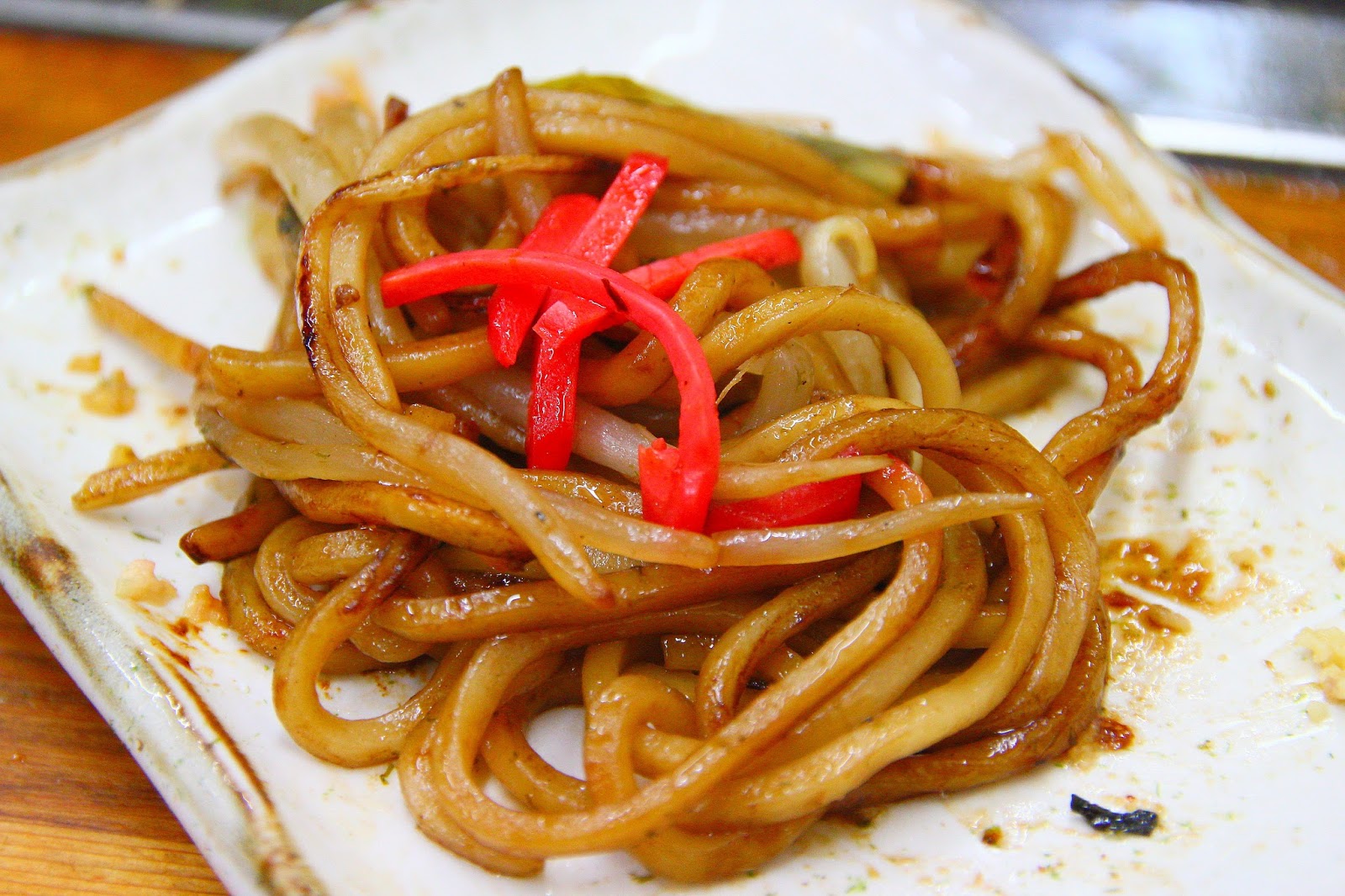 在還沒上菜前本以為是麵糊改用蕎麥粉製作,但上桌後其實是用蕎麥麵去做炒麵,炒麵食材有豬肉片、蕎麥麵、高麗菜、紅薑絲、豆芽菜、海苔粉,然後在廚房炒好後再放至鐵板上利用高溫鐵板嗆一下醬香味,筆者建議可以拿小鏟子再把麵跟醬炒勻這樣鹹度就剛剛好,