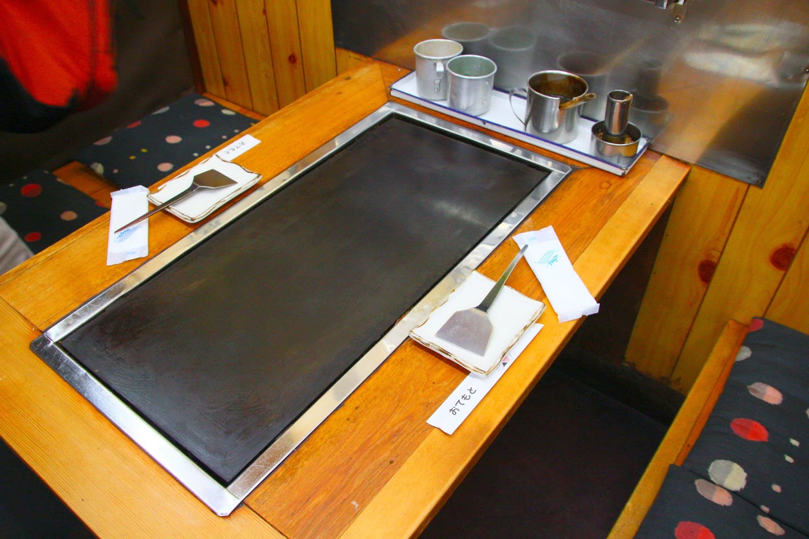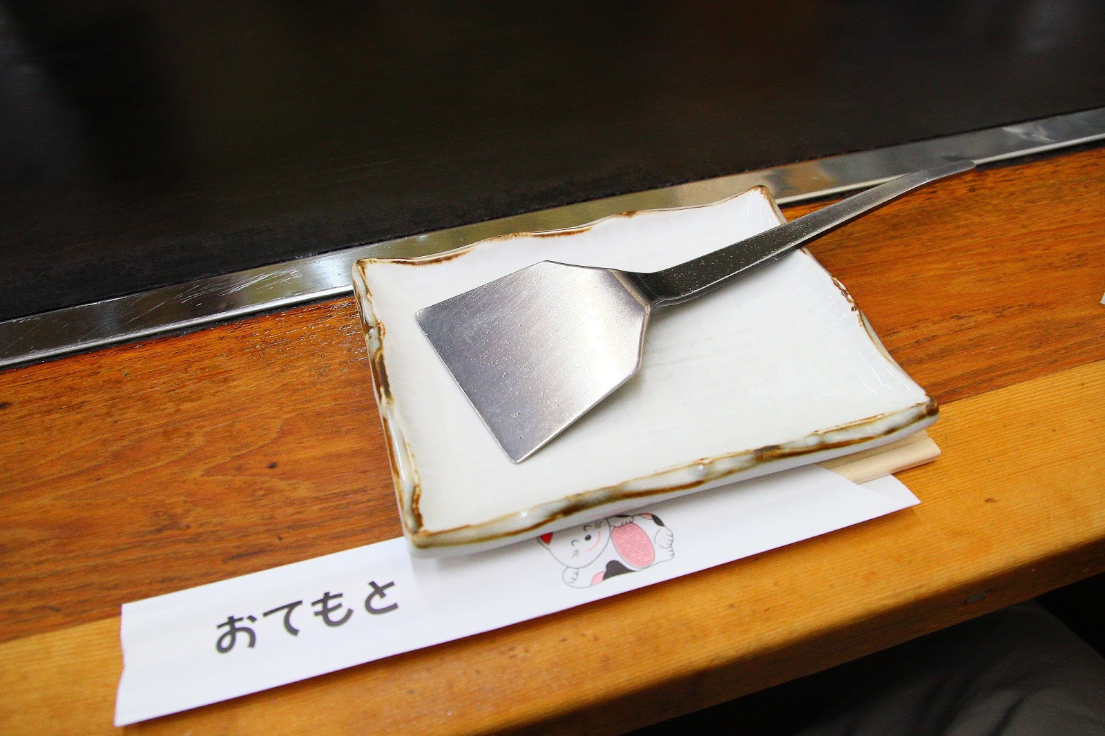 鐵板旁由左而右放著的分別是柴魚片粉、海苔粉、醬汁、油,