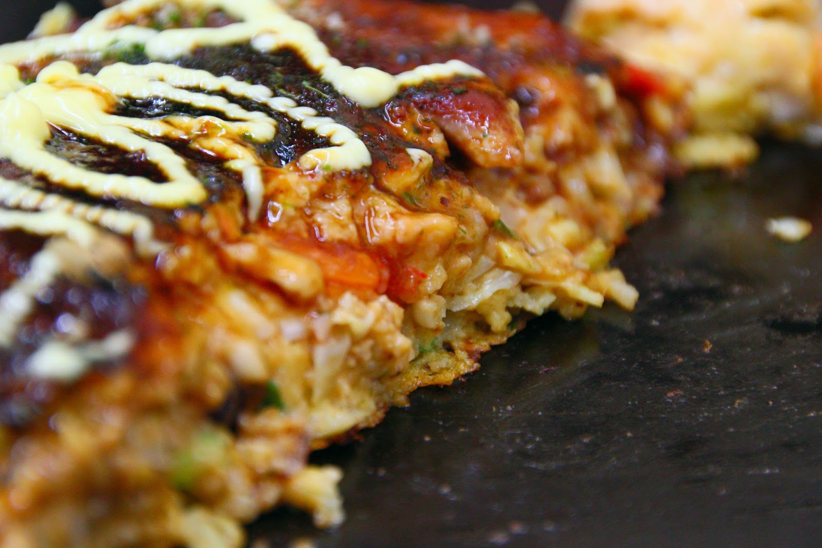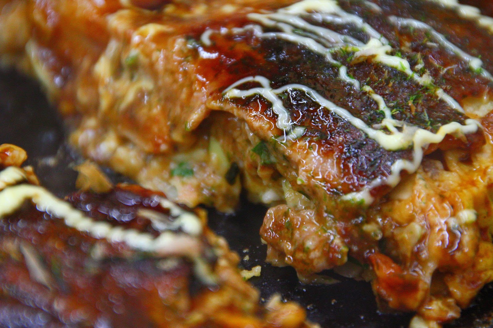 製作過程是先把整碗的料用力的攪拌至全部均勻,然後倒到抹了油的熱鐵板上再把培根放在旁邊煎,培根稍微煎一下後就放到麵糊上,麵糊煎到底部開始凝固時翻面(這時培根跟另一面生麵糊在鐵板上)蓋上小鍋蓋悶煎,這時培根那面跟鐵板間開始冒出肉香味,然後服務生專業的翻面,一翻面我整個口水差點滴下來,完美誘人的焦黃色跟陣陣傳來的培根香瘋狂誘惑著嗅覺,然後再蓋上小鍋蓋悶煎一下,再次翻開時就準備最後階段了,在培根那面均勻抹上特調醬汁灑上柴魚粉、海苔粉最後擠上美乃滋,醬汁抹上時會順著邊緣滴落到鐵板上,這時醬汁揮發出的香味再次讓筆者傻傻望著大阪燒不自覺張嘴口水差點滴了下來,
