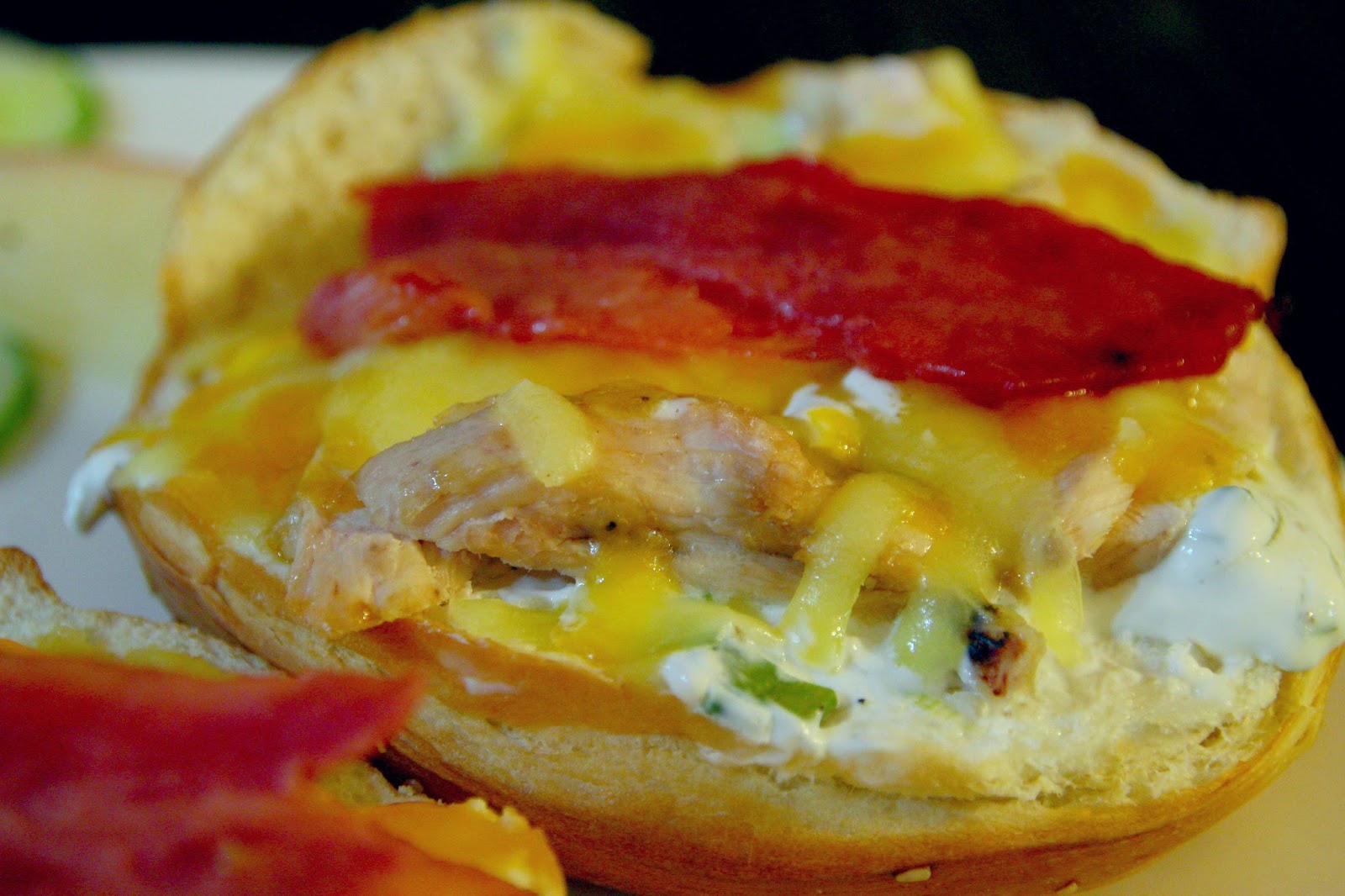 雞肉貝果由上而下分別是,烤的焦香的培根、融化的起司絲、雞肉、下面再一層特調酸奶,