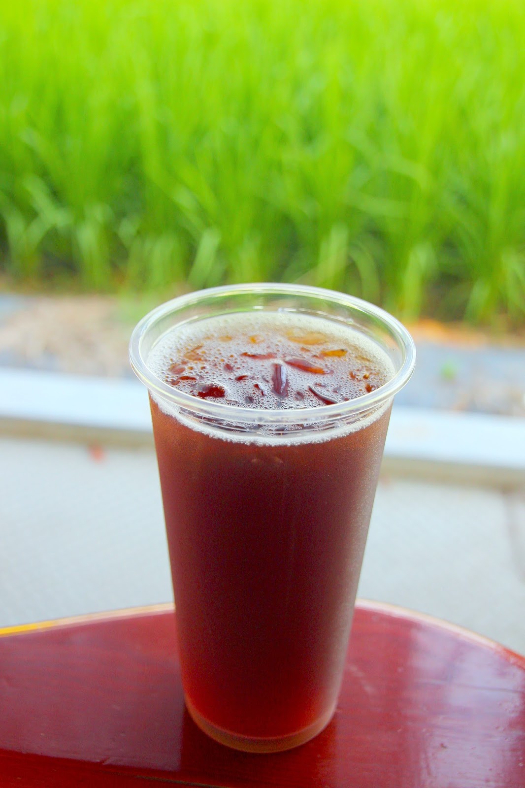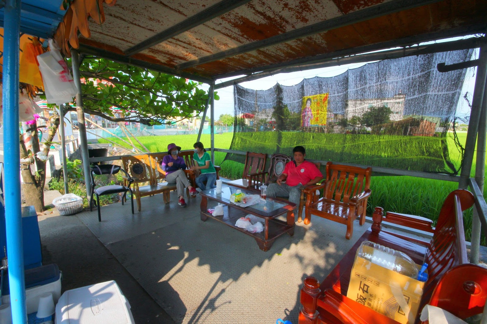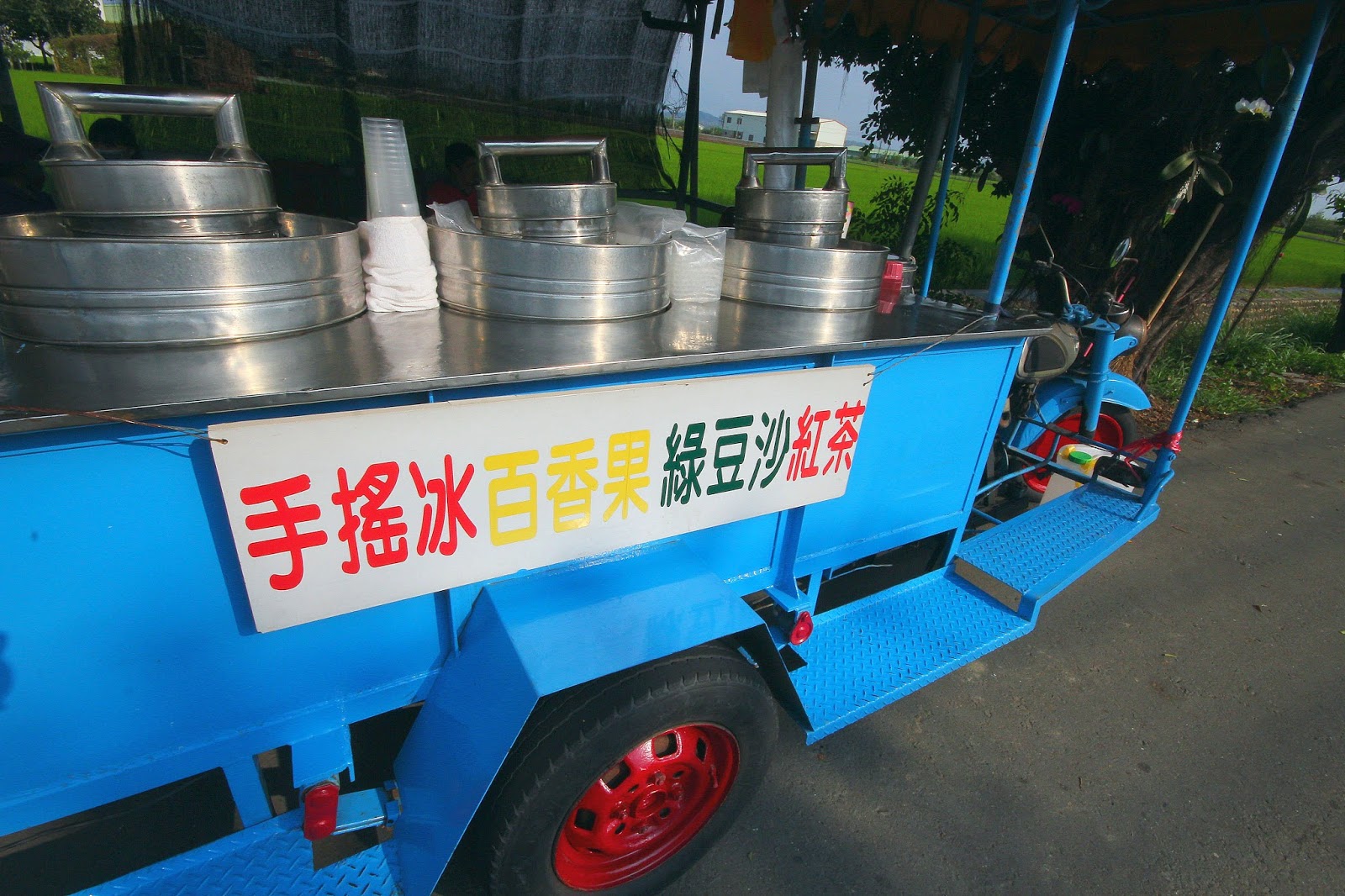 大樹蔭下的攤車後方是一整片綠油油的稻田在這喝杯冷飲很自然的就放鬆了,