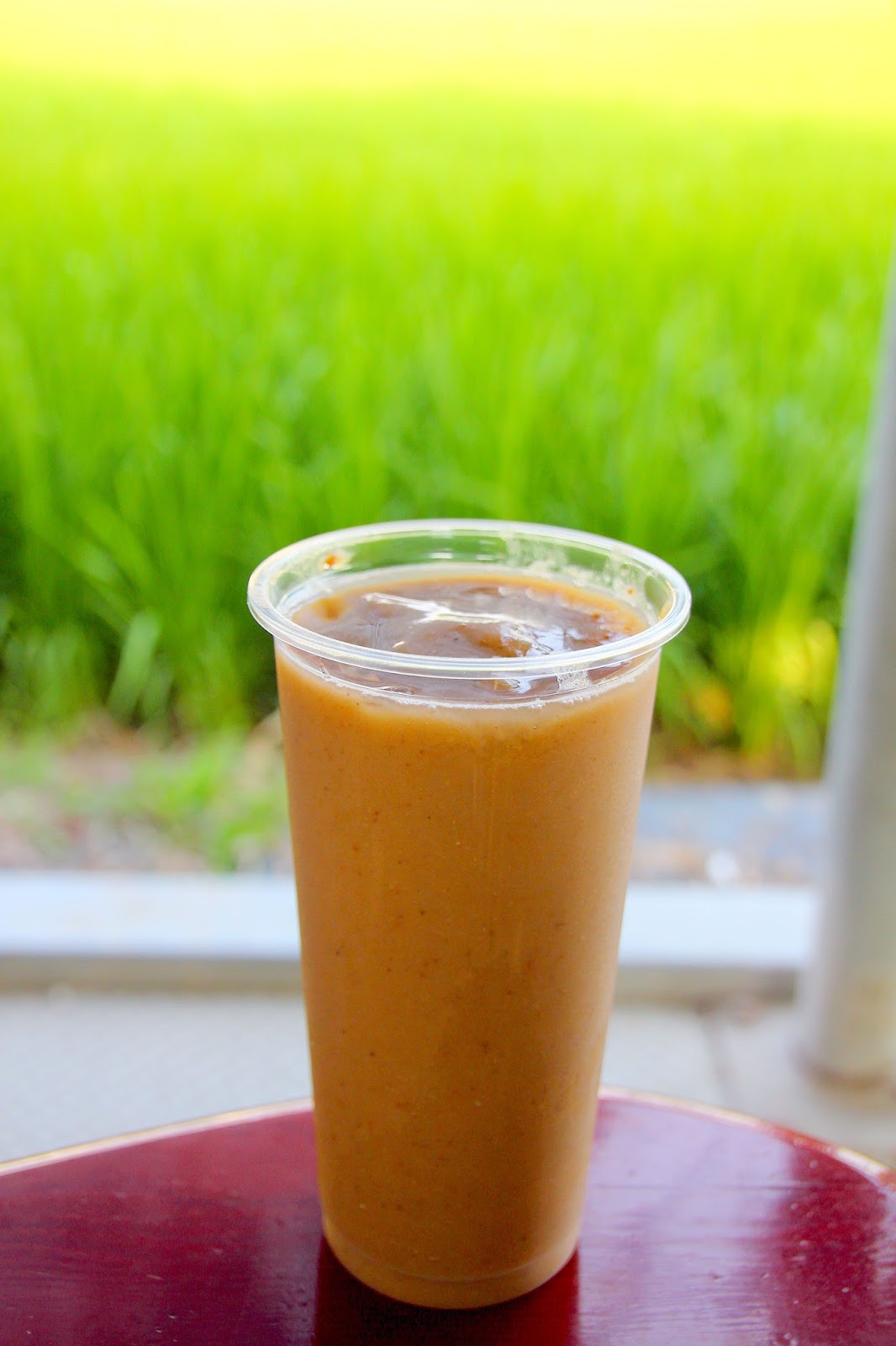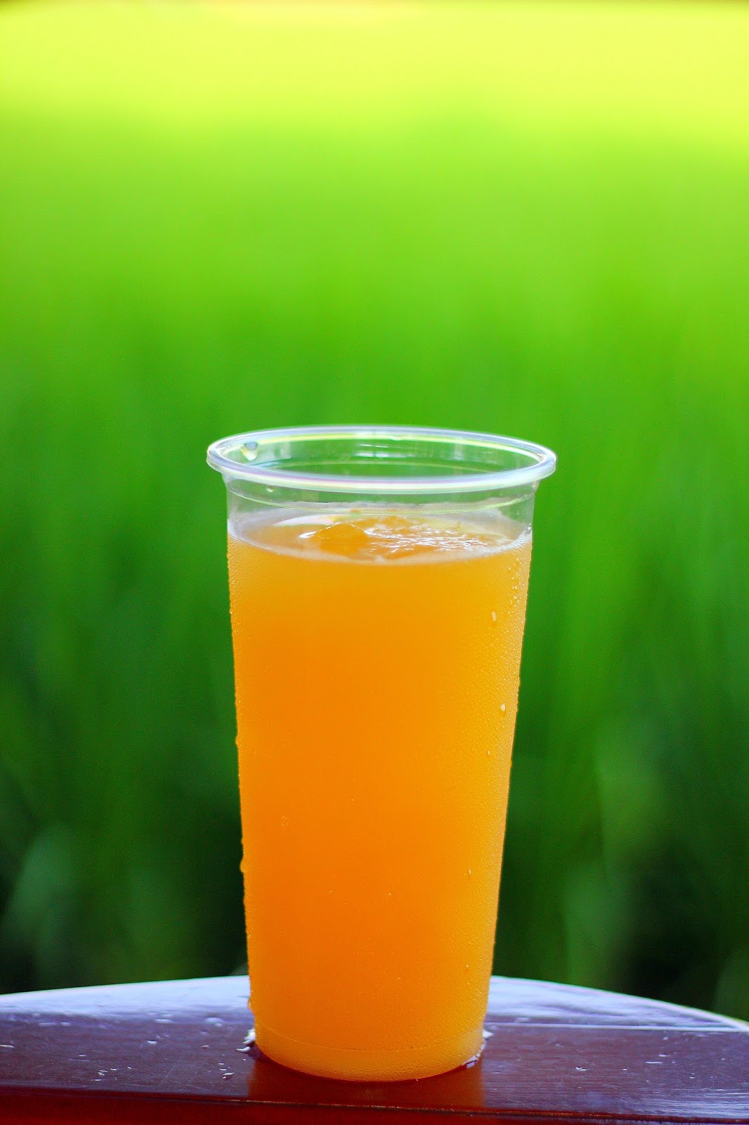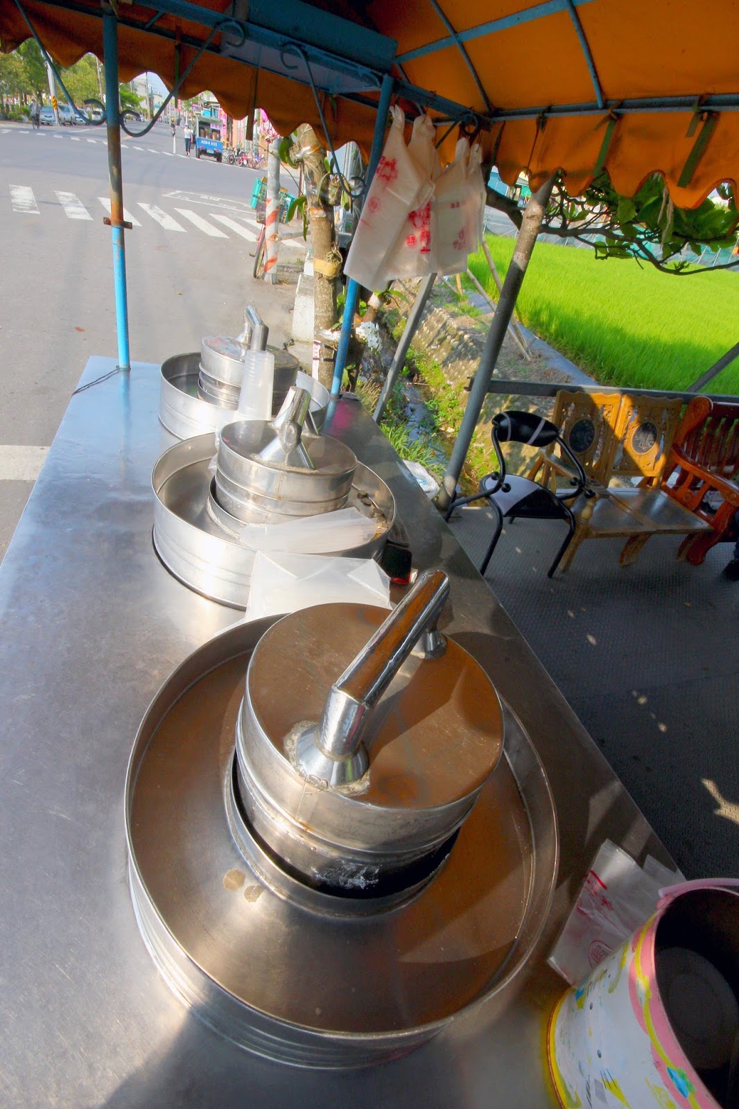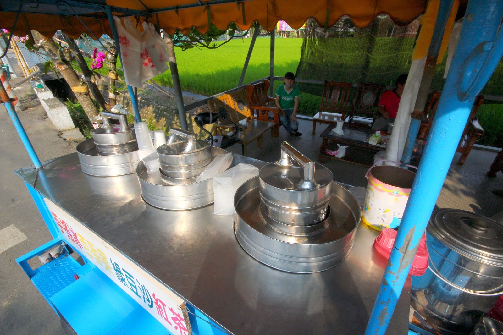 大樹蔭下的攤車後方是一整片綠油油的稻田在這喝杯冷飲很自然的就放鬆了,