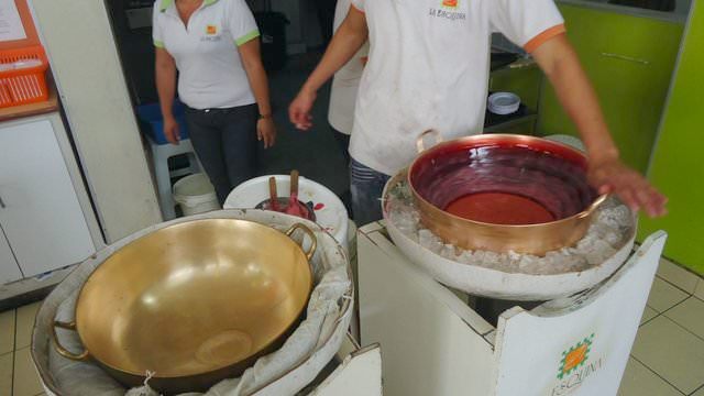 蓋上蓋子後旋轉最上面的把手,這時桶子內的果汁會因離心力環繞在桶壁上,然後果汁接觸到低溫就漸漸的結成霜,圖片裡果汁最外圈就是果汁霜了,老闆娘再用長柄把果汁霜敲落,一直重複這個動作就會有手搖冰啦!
