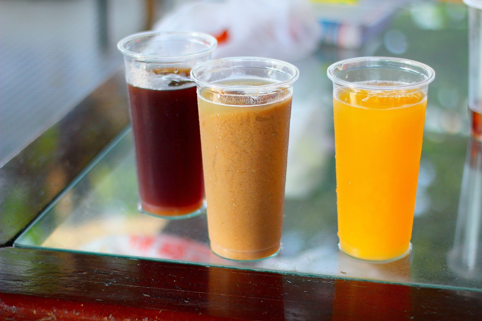 小攤車上只賣三種冷飲百香果、綠豆沙、紅茶,