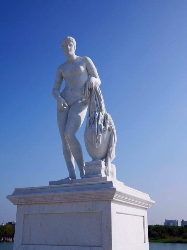 阿芙蘿黛蒂是希臘神話中最美的女神,代表著愛情、美麗與誘惑,根據希臘神話,阿芙蘿黛蒂誕生於海洋的泡沫中,並從大貝殼裡走出來,由於她動人的美貌,引起眾天神的追求,但最後美神嫁給了火神赫菲斯托斯,此雕像呈現阿芙蘿黛蒂準備下海沐浴之姿態,女神身體向前微傾小腿略微彎曲展現優美的S形曲線,女神的目光注視著鄰近水面表情嬌羞,將女性的柔美表現得淋漓盡致,而這件作品的原作也是現存最早的全裸女性雕像,