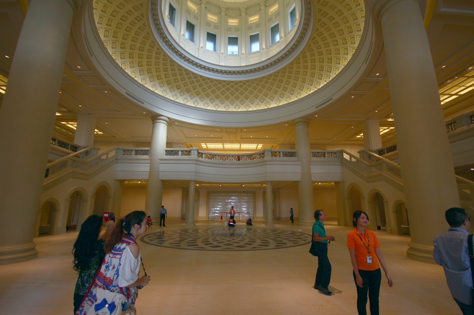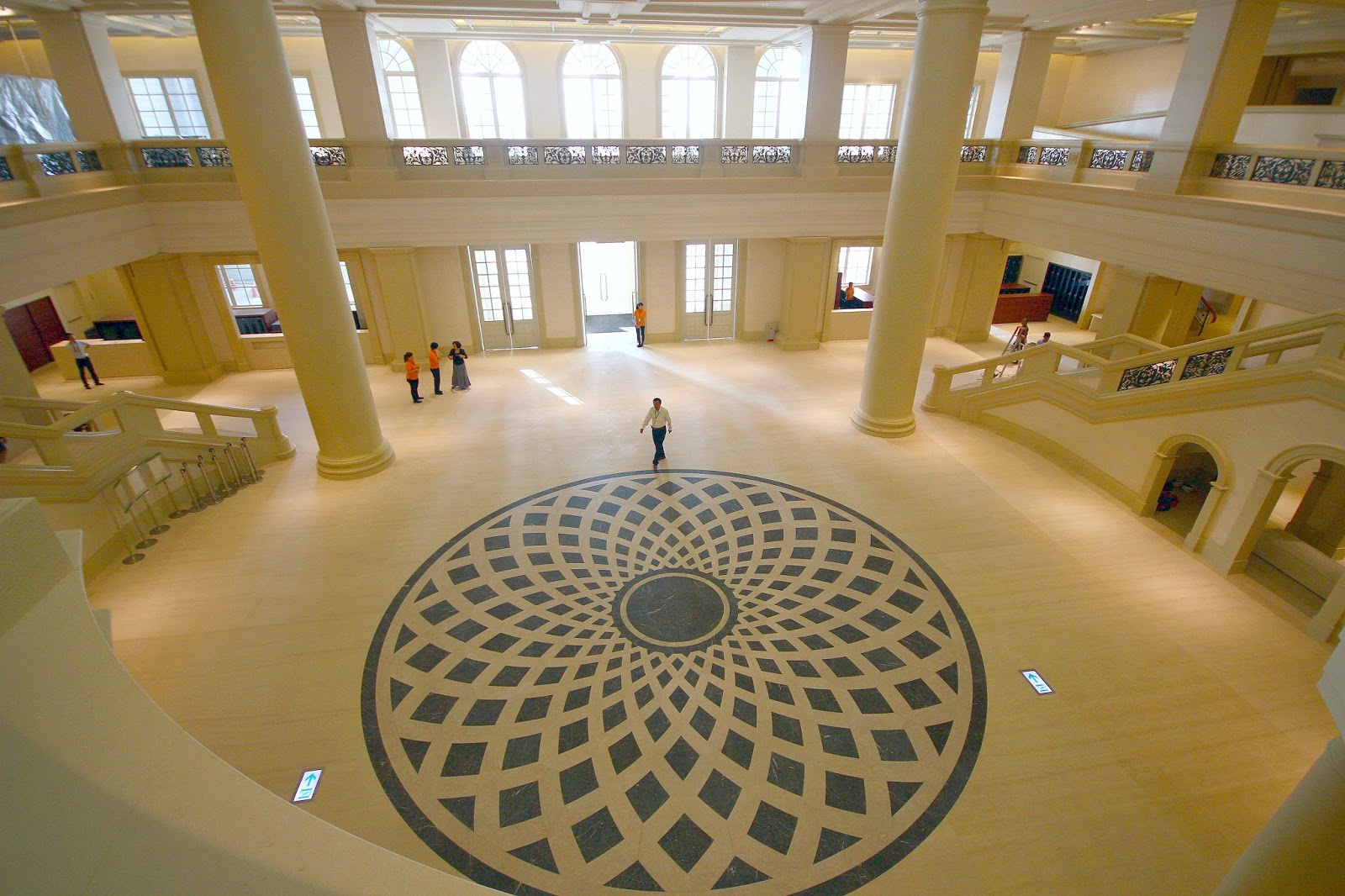 大廳中央地板上的圖騰跟正上方的山茶花圓頂相互呼應著,