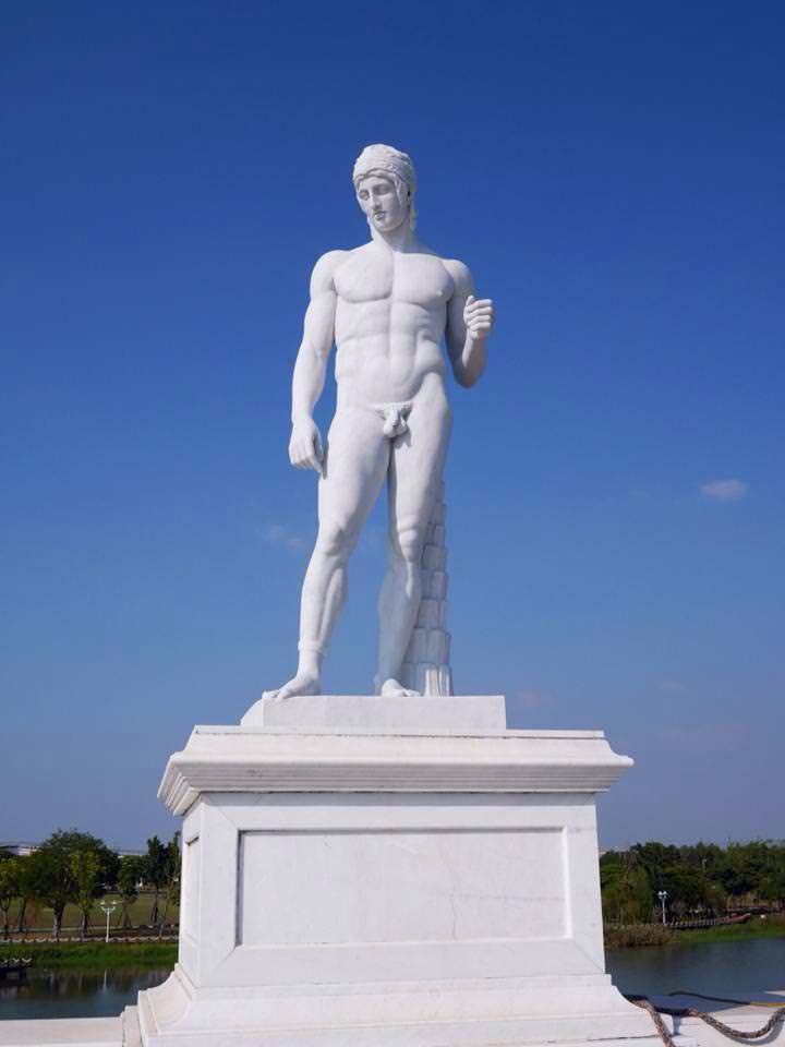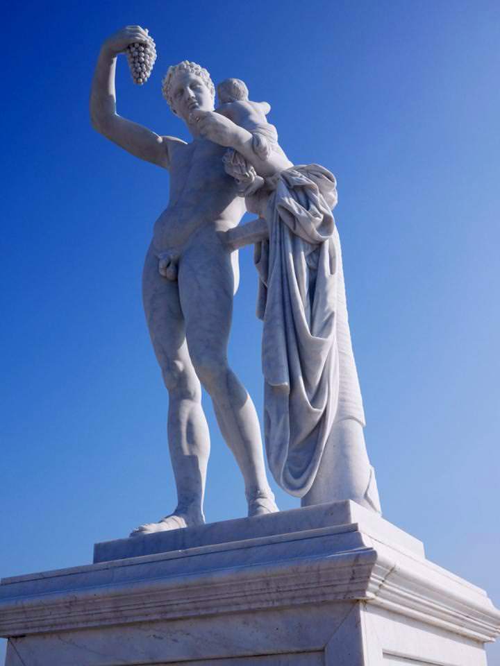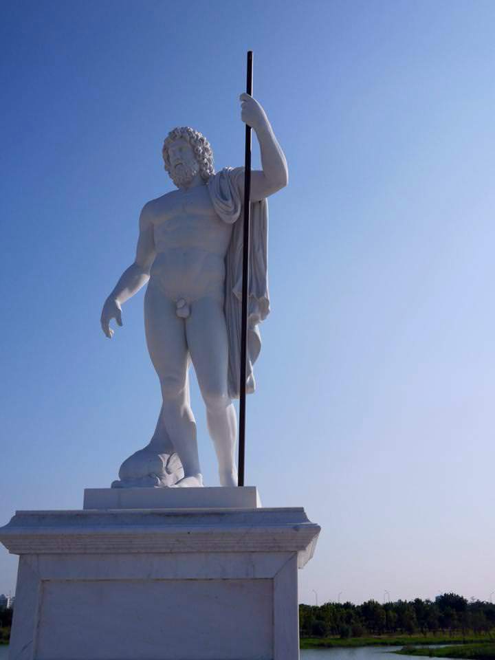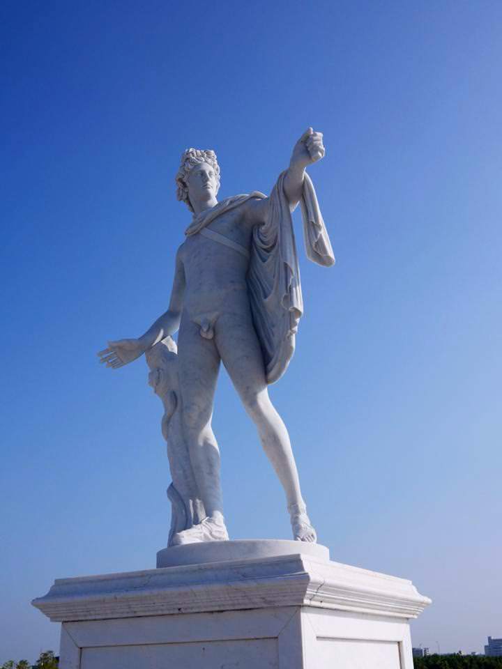 噴泉再往前走是矗立著希臘12位主神的奧林帕斯橋,橋上雕塑也呼應著博物館正中央希臘神殿式正門,