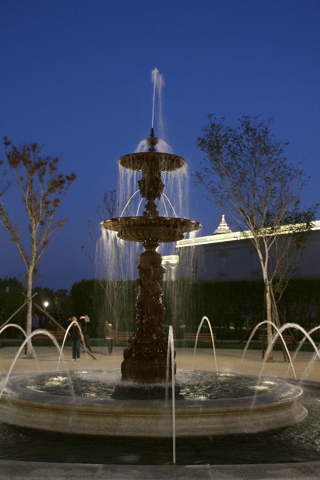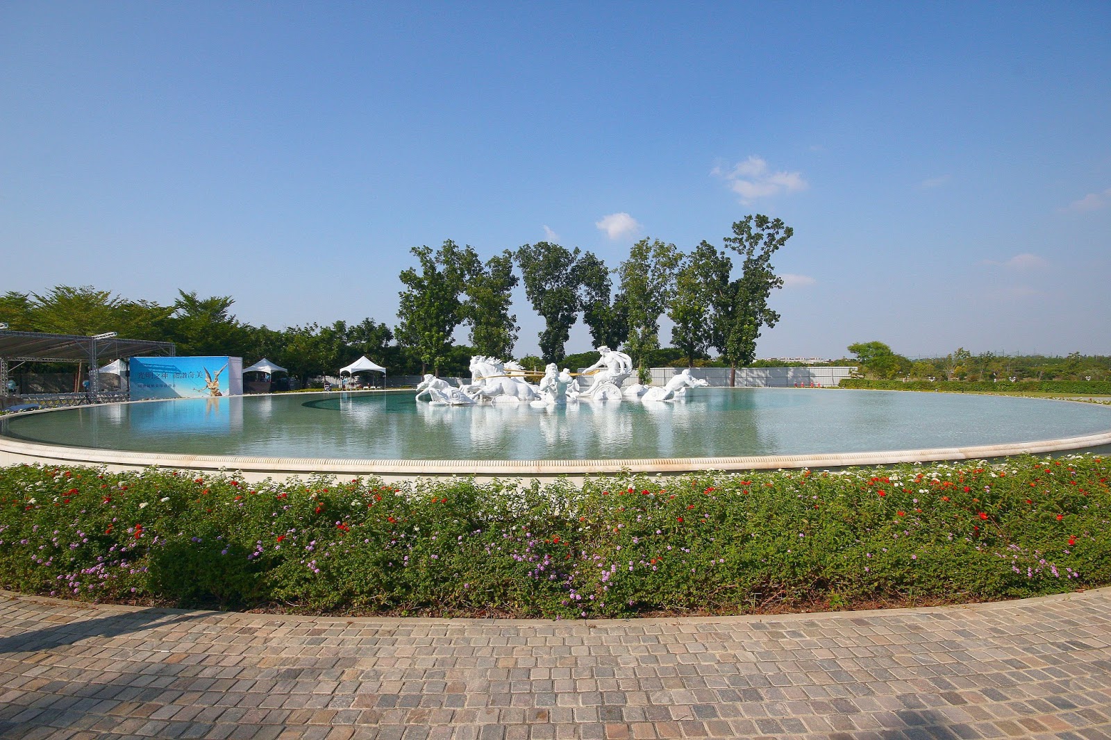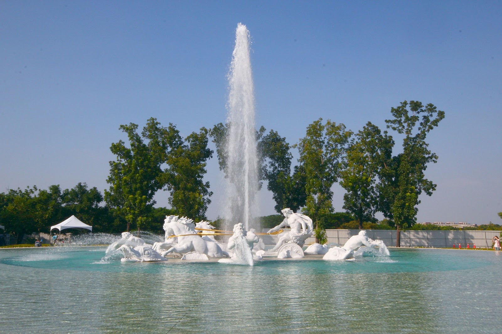 噴泉使用了義大利白色卡拉拉大理石為建材在陽光的照射下耀眼奪目,運氣好在噴水時還會襯著一道彩虹更顯不凡,