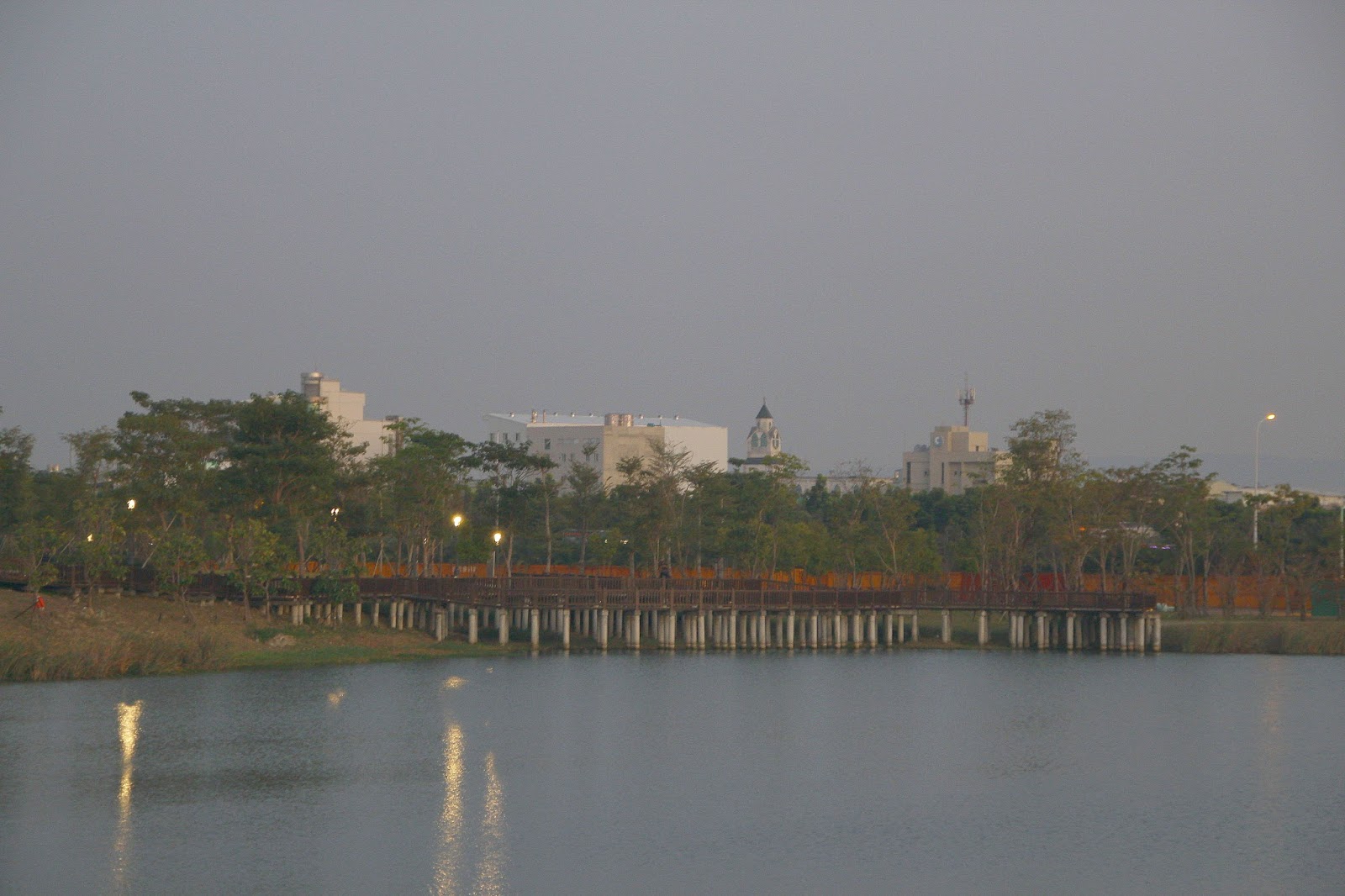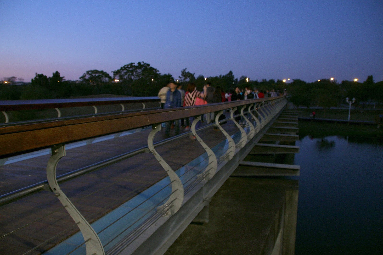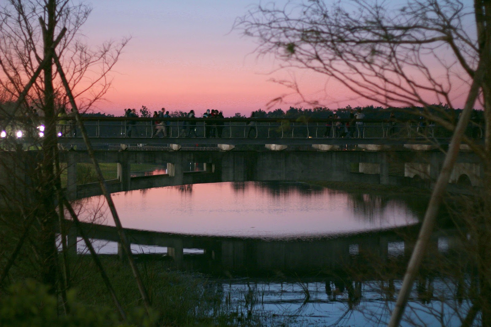 傍晚霓紅的彩霞倒映在繆思湖上,粉紅的氛圍呼應著丘比特之名與經過橋上的一對對戀人們,