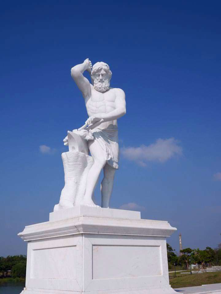 赫菲斯托斯是火神與煉鐵神,專門為眾神打造神器,他是宙斯與希拉之子,出生時因長相醜陋而遭母親拋棄到人間,之後又遭逢意外成為瘸腿,此雕像呈現中年蓄著鬍鬚的赫菲斯托斯,他左手握住鐵鉗,右手高舉鐵鎚,顯示火神正在冶煉金屬之情景,