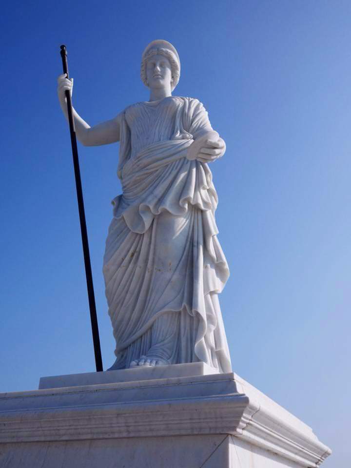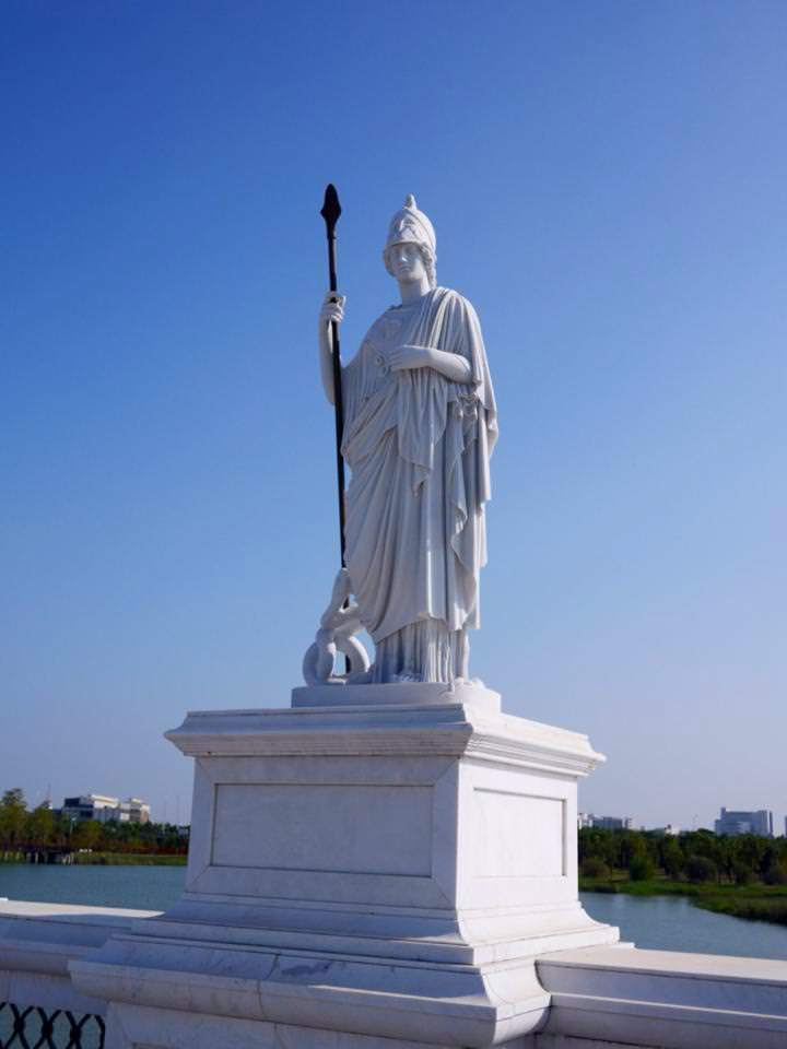 雅典娜是智慧女神、手工藝者的守護神,同時也是幫助戰士的戰爭女神,雅典娜是宙斯與思慮女神密蒂絲的女兒,傳說中她由父親宙斯的頭部所誕生,這座雅典娜雕像頭戴頭盔,身披長袍,右手拿著長矛,衣袍底下穿著她精製的戰甲,她的面容冷靜且嚴肅,展現出智慧女神的性格,雕像右腳旁的蛇出自雅典娜為蛇守護者之典故,