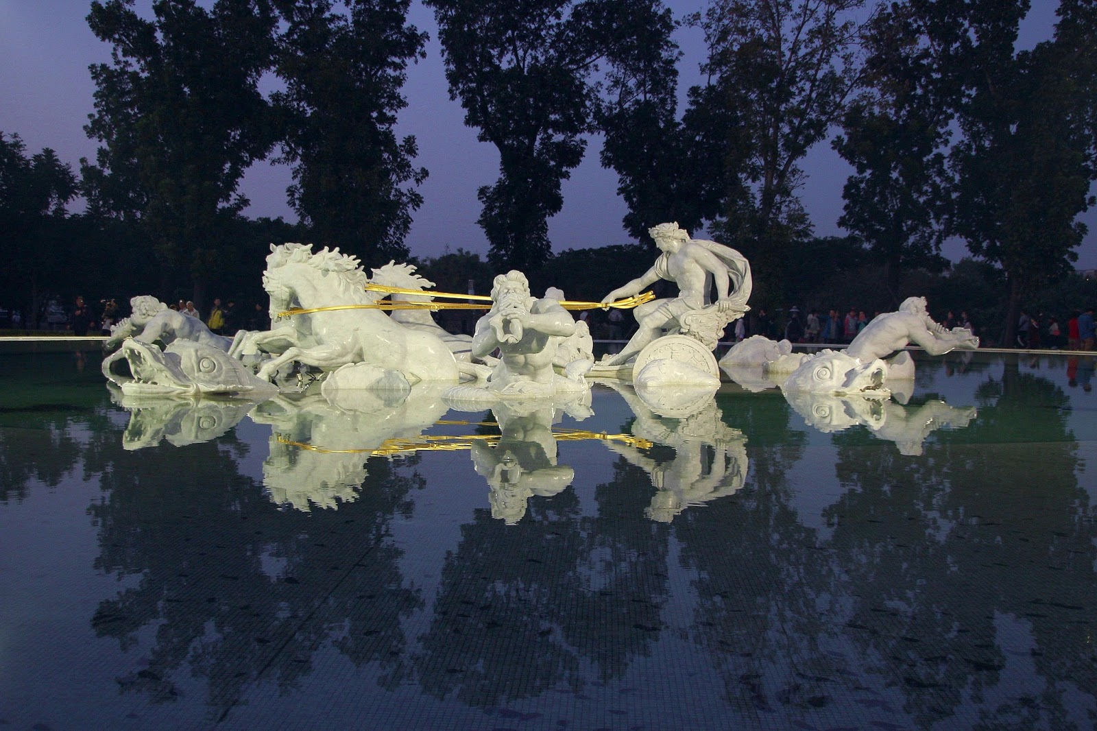 夜晚打上燈光的阿波羅噴泉在池面倒映出另一座噴泉,在夜色的襯托下義大利白色卡拉拉大理石的質地更為明顯,