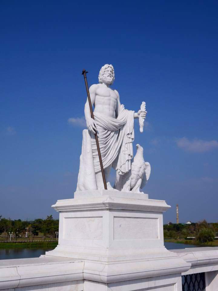 宙斯為天界第一主神,眾神之王也是奧林帕斯山的主宰,他是天空之神,掌管宇宙、天氣、秩序與命運,此雕像將宙斯塑造成一位擁有獅鬃般頭髮和鬍鬚的中年男子,身材高挑且健壯下半身披著層層衣摺的長袍,左手握著雷電神情威嚴且富含氣勢,位於雕像右側的動物則是宙斯的聖物老鷹,