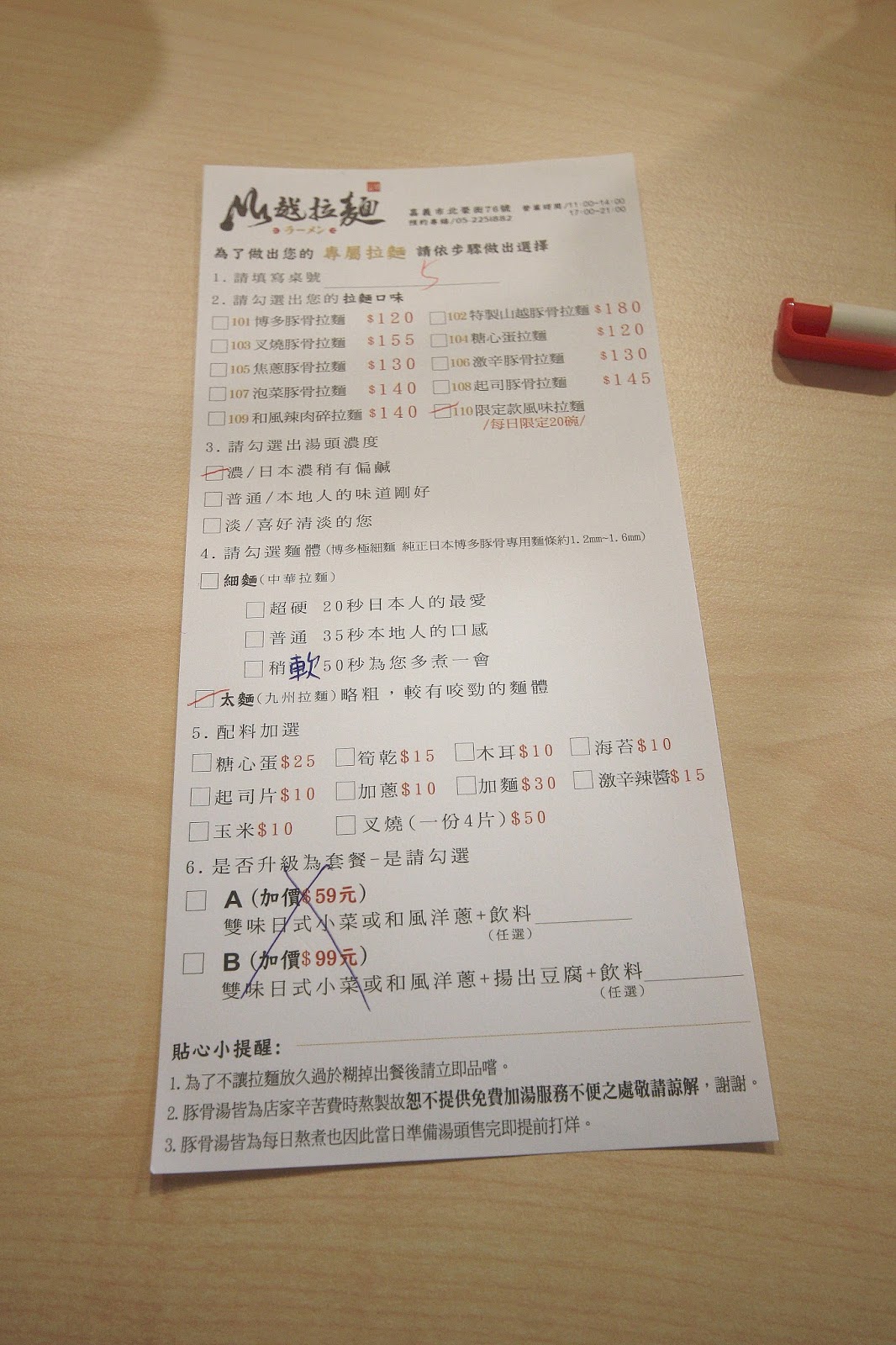 湯頭濃度、麵的種類、麵的熟度皆可選擇,筆者自己最愛濃湯+細超硬(其實不會很硬啦),