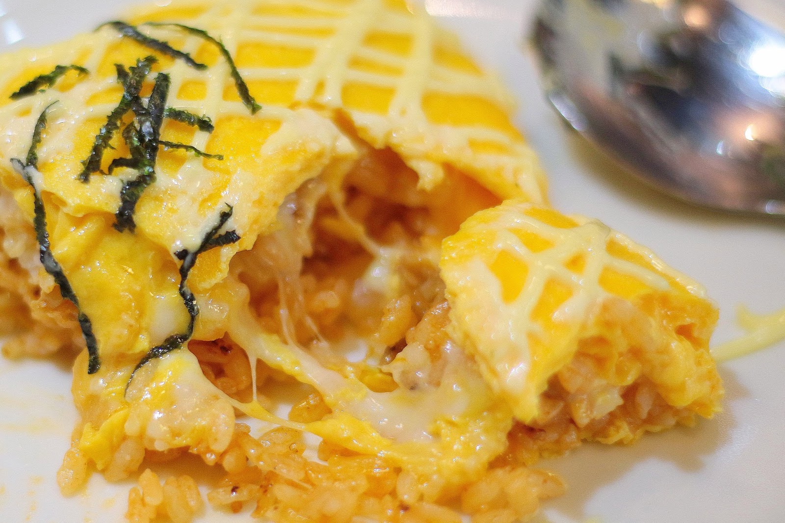 蛋皮熟度比洋蔥工坊的熟但仍維持在軟嫩的口感,裡面炒飯皆均勻裹上番茄醬,如果單吃番茄味不會很濃,但配上番茄醬一起吃會完全改觀,炒飯裡的雞肉塊有先醃過,