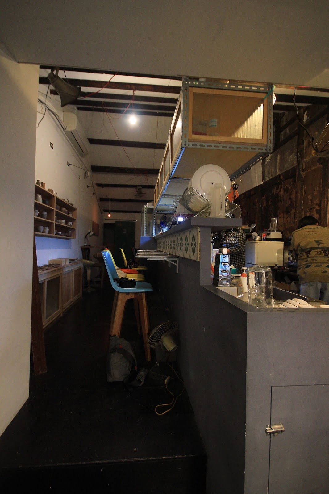 吧檯座椅很像以前公車站的椅子改裝的,吧檯桌是烤盤,