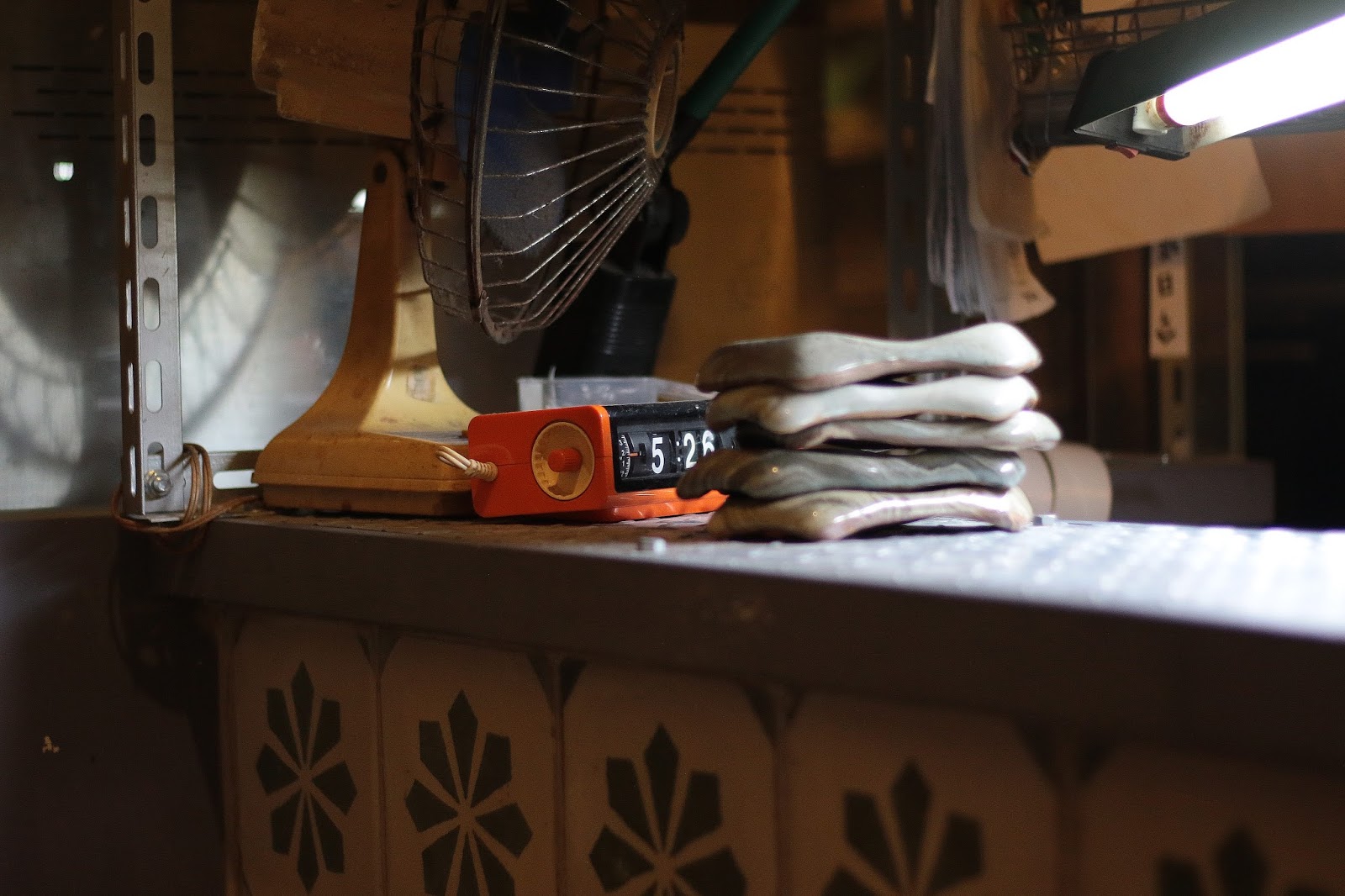 吧檯上放著老電風扇與翻頁鐘,