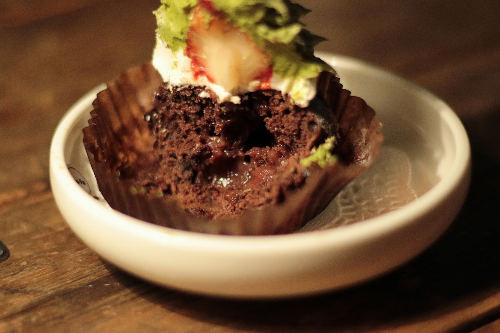 底下杯子蛋糕是巧克力口味,而且中心包有果醬,蛋糕裡還吃的到小小的巧克力塊,