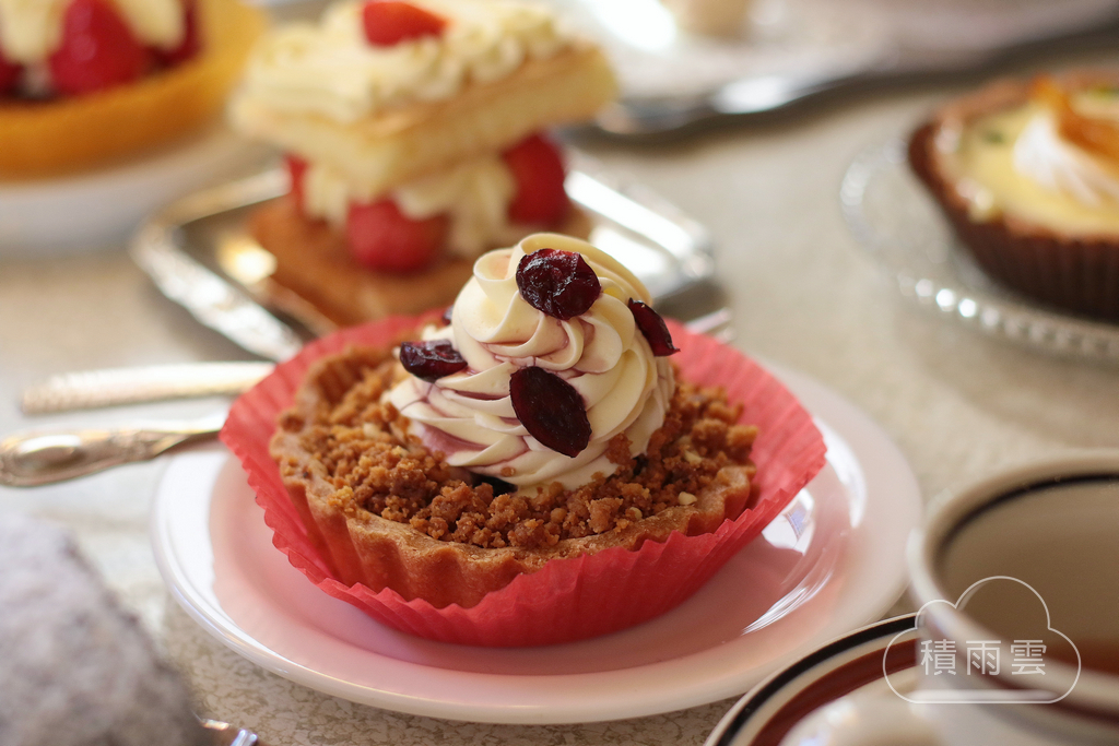塔皮內是香濃的乳酪餡,上方擠上柔滑的十勝奶油醬與酒釀蔓越莓乾,