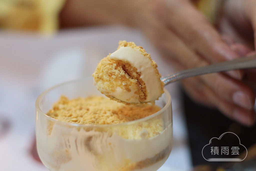 這一匙在入口時白色層隨即甜潤的化開在舌尖,接著是沙沙感與些微顆粒感的餅乾豐富口感層次,任誰都想一口接一口,