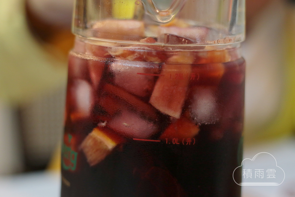 以葡萄牙紅酒Encostas Do Bairro為基底加入水果丁(柳橙、蘋果、水梨)、蘇打水...等去調配的酒類飲品,口感順暢微甜中帶著淡淡的辛口(我猜是加了其他烈酒調配),