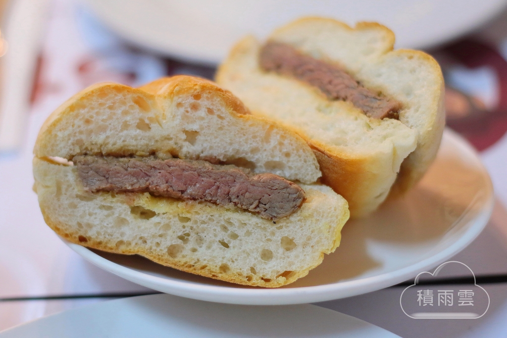 餐點一上桌中間那塊厚實鮮嫩的牛排馬上吸引眾人目光,牛肉熟度剛好沒有過多調味能嚐到純粹的牛肉鮮美,吃膩豬扒包的好選擇,