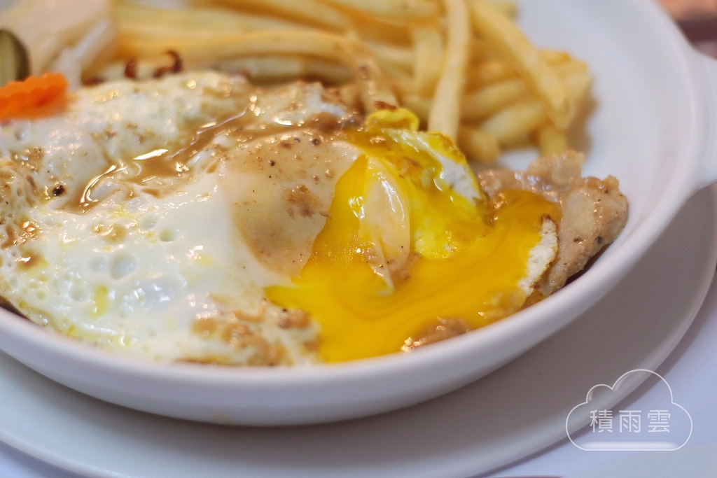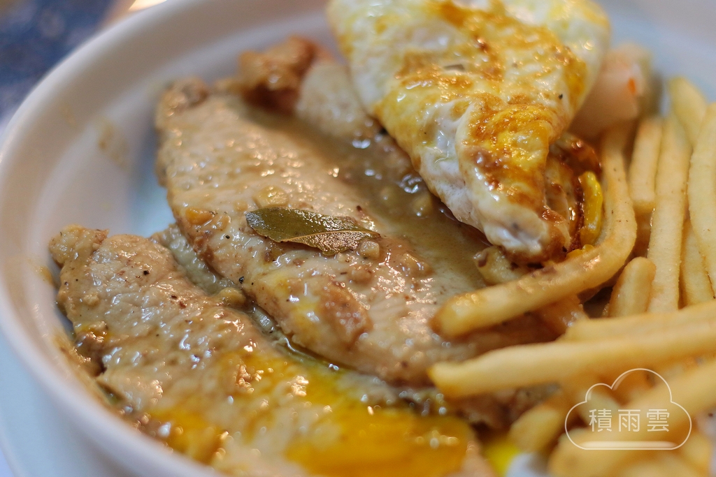 食用時把半熟蛋搓破讓蛋液結合白酒醬汁,里肌熟度依舊掌握得宜口感柔軟不乾柴,煮切過的白酒使醬汁香醇,肉排沾上醬汁後月桂葉帶出肉香,餘味有葡萄酒的微澀感既解膩也引發食慾,