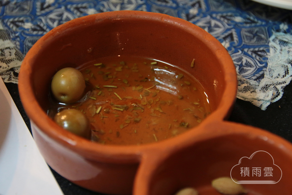 店家貼心附上自己醃的橄欖給我們搭酒,醇厚的味道微鹹一次吃一小口就很夠味,盛裝的器皿也有巧思旁邊一格是放籽用的,