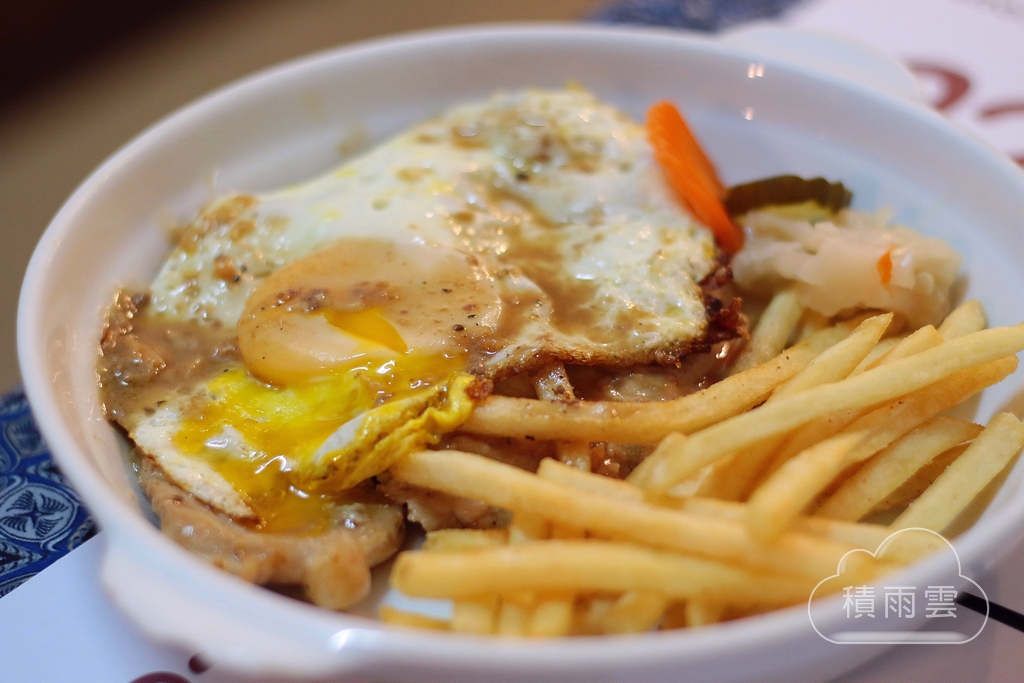 這個貴一點65葡幣但這價錢在澳門我非常能接受,這道有2大片的嫩煎豬里肌、炸薯條、醃漬蔬菜(黃瓜、紅蘿蔔、白花菜)、半熟蛋,