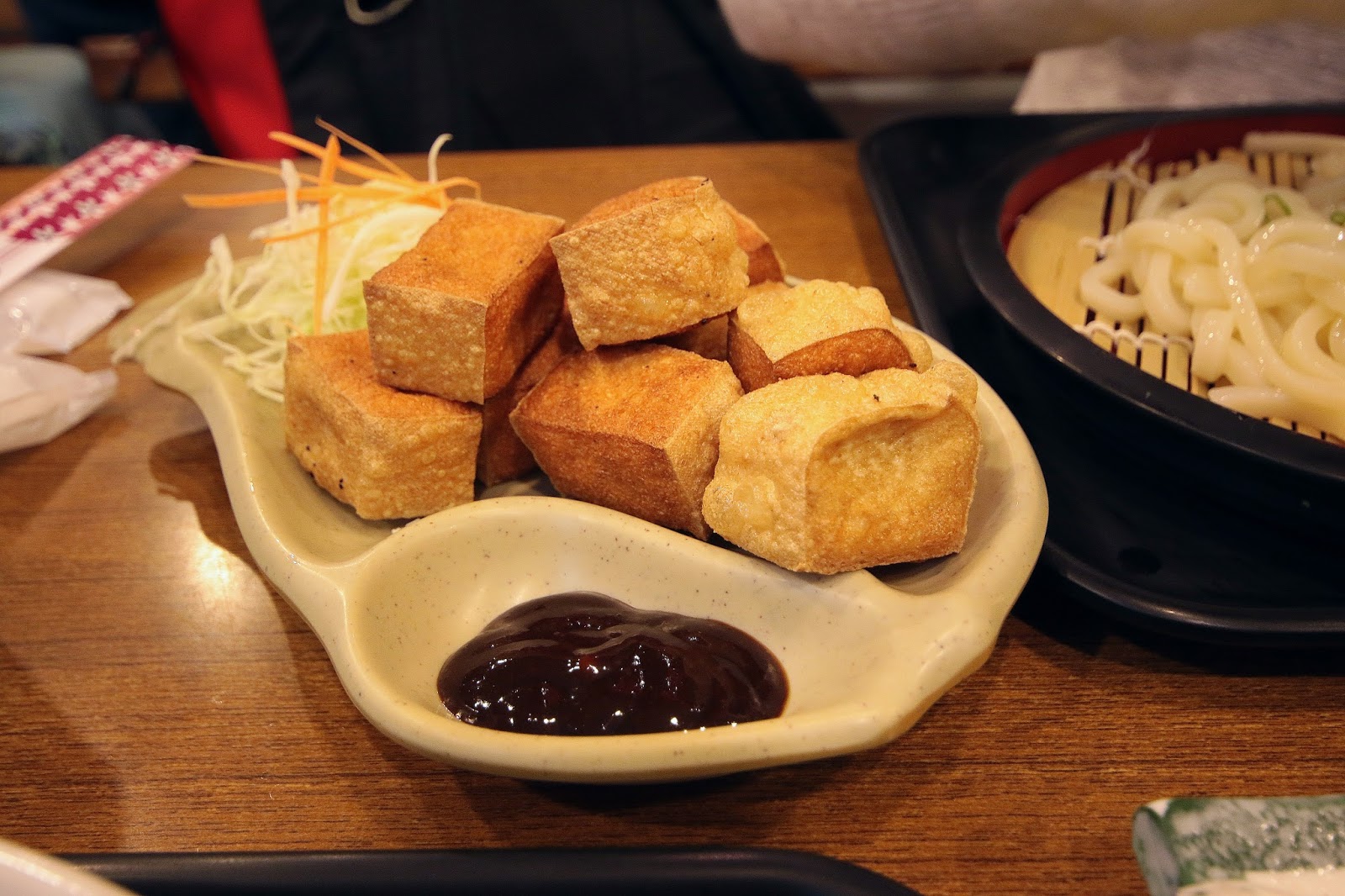 豆腐外酥內鬆綿,素食是搭配甜口中帶點鹹味的紅味噌沾醬,