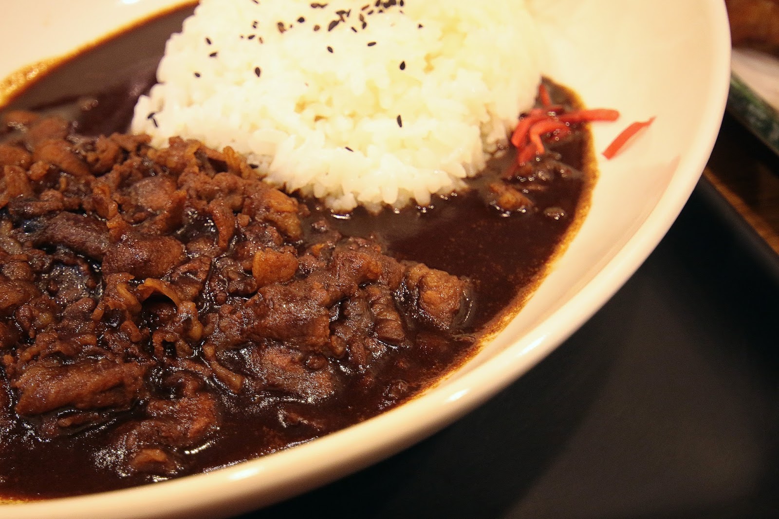 黑咖哩吃下第一口就能明白"黑"是指何物了,味蕾除了咖哩味外能明確的嚐到黑楜椒味,入喉後殘留口中的餘味是黑胡椒的微辣,不過在咖哩中吃不到黑胡椒粒歐!