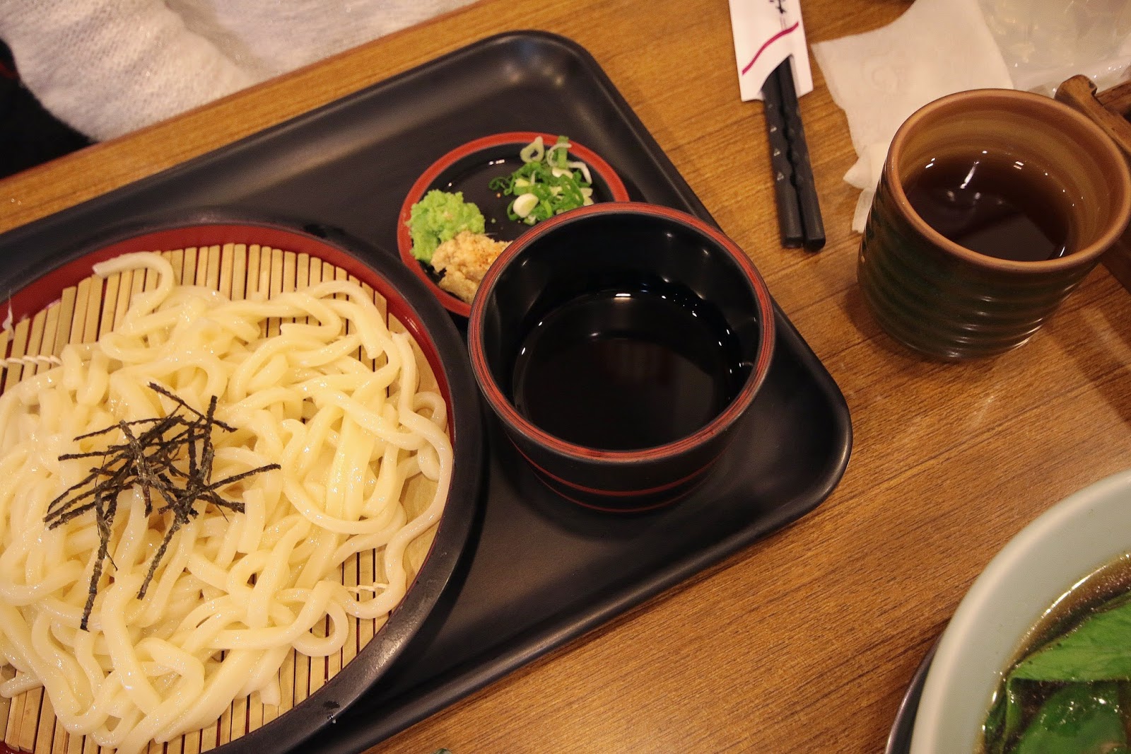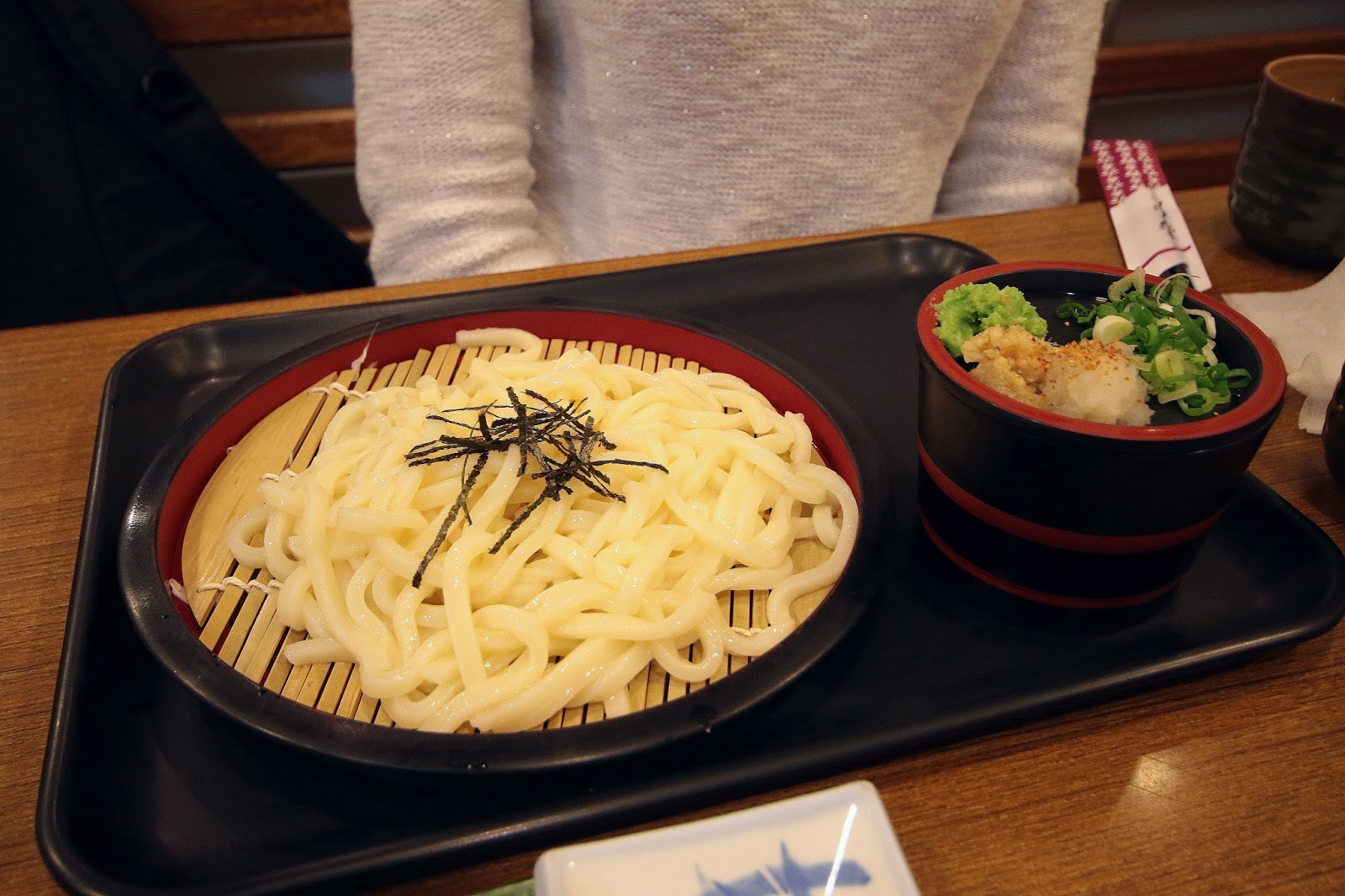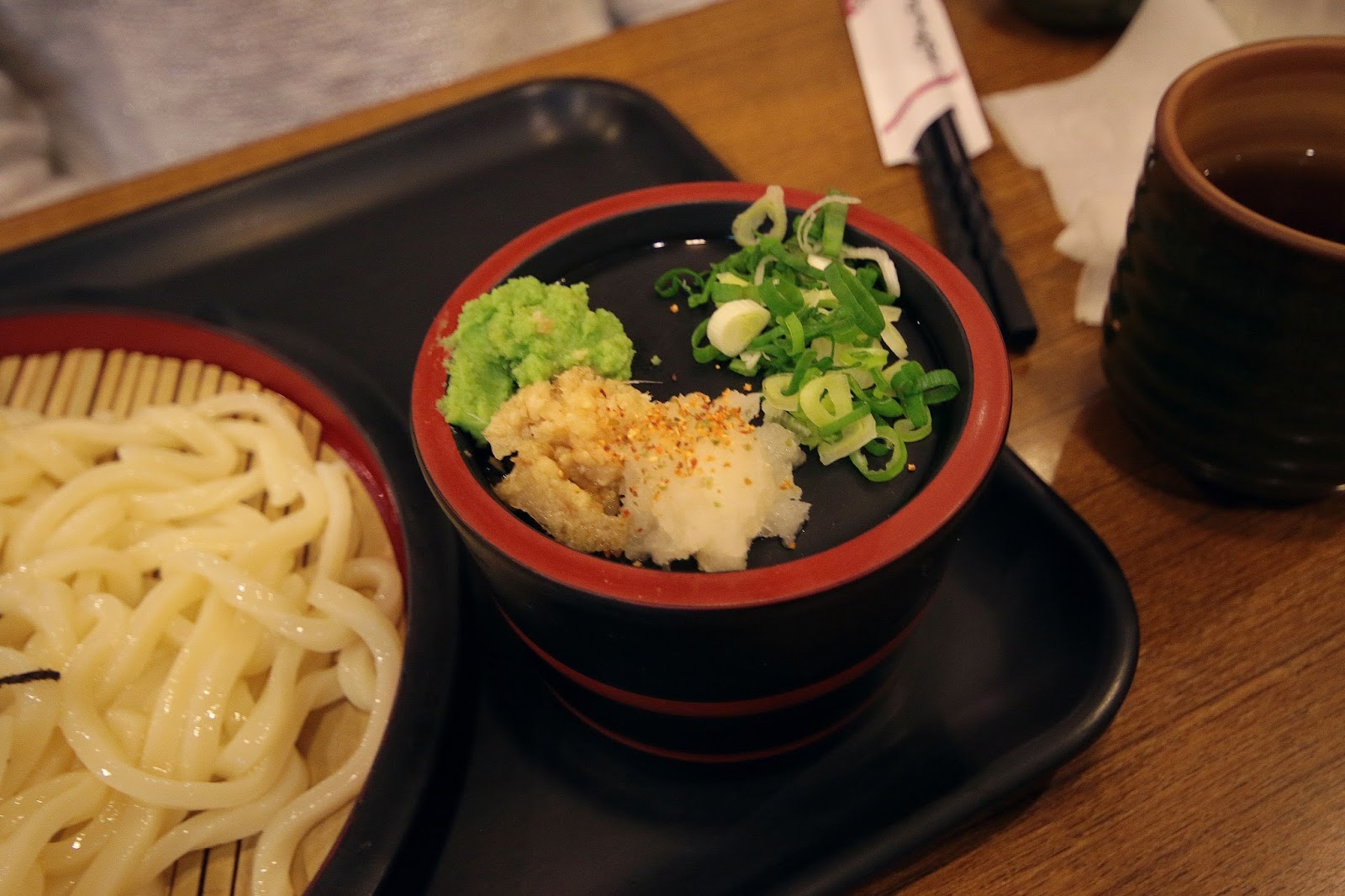 烏龍麵有冰鎮過口感有彈性,配料底下醬汁是甘甜口味的柴魚醬油(素食為一般醬油),