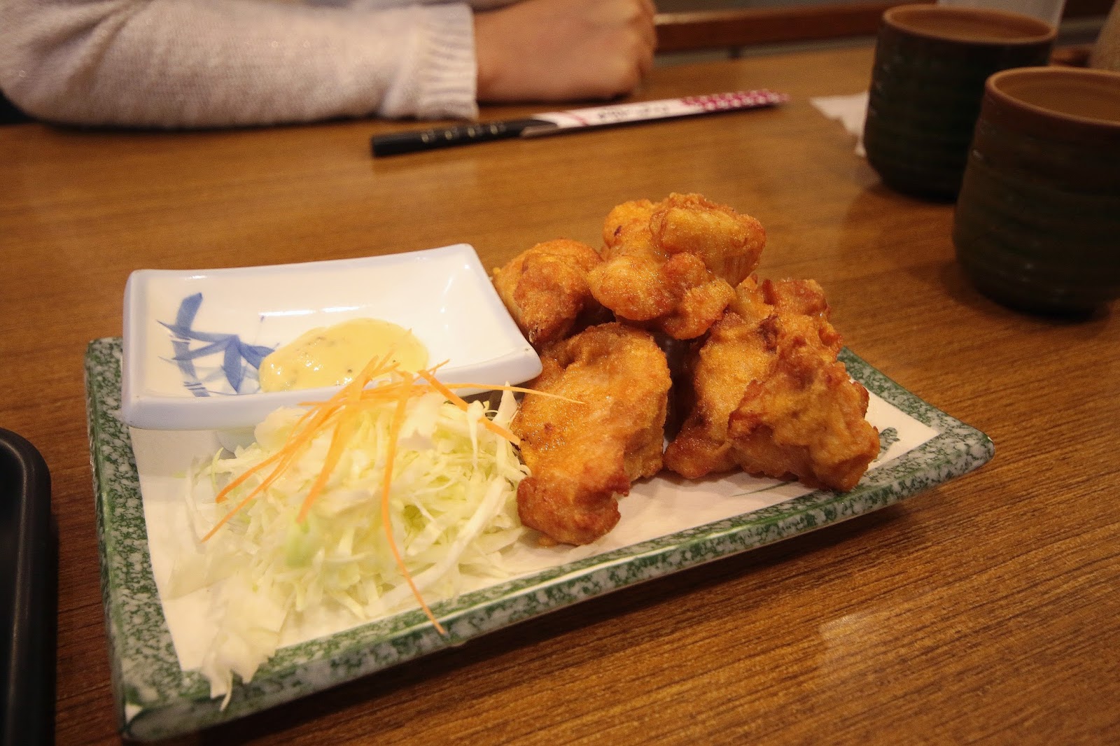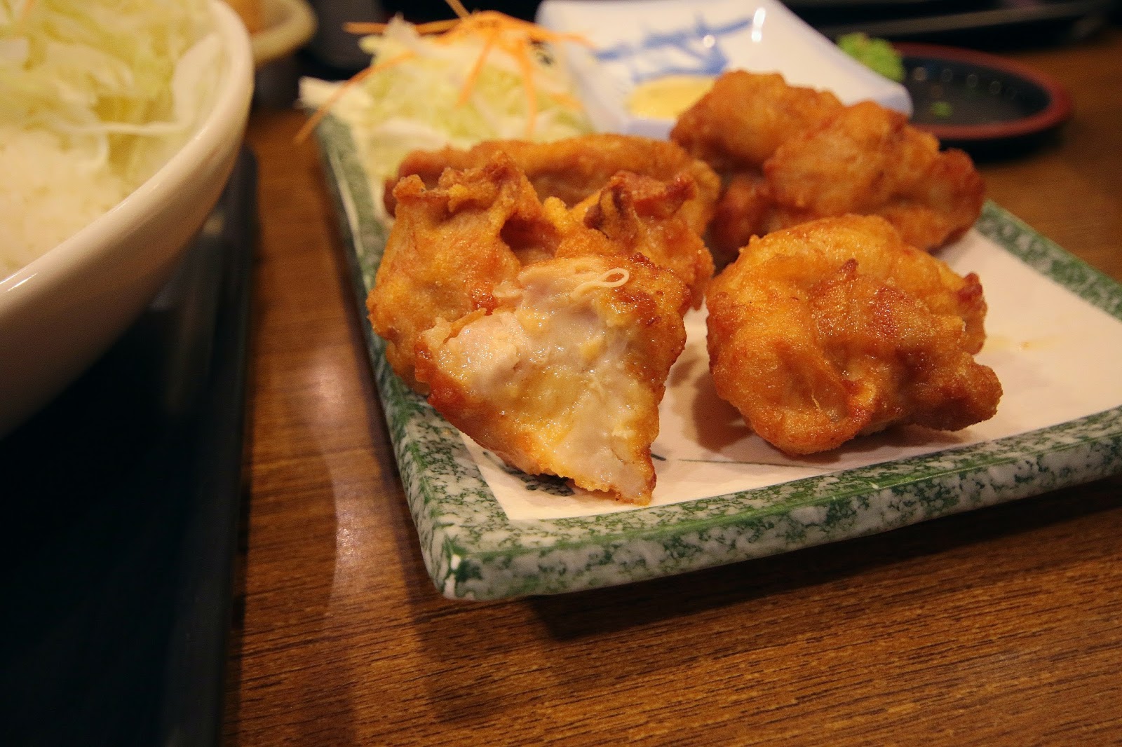 炸雞配菜有高麗菜絲與一點紅蘿蔔絲,沾醬是哇沙米美乃滋口味偏甜我猜是用桂冠做底醬調的,