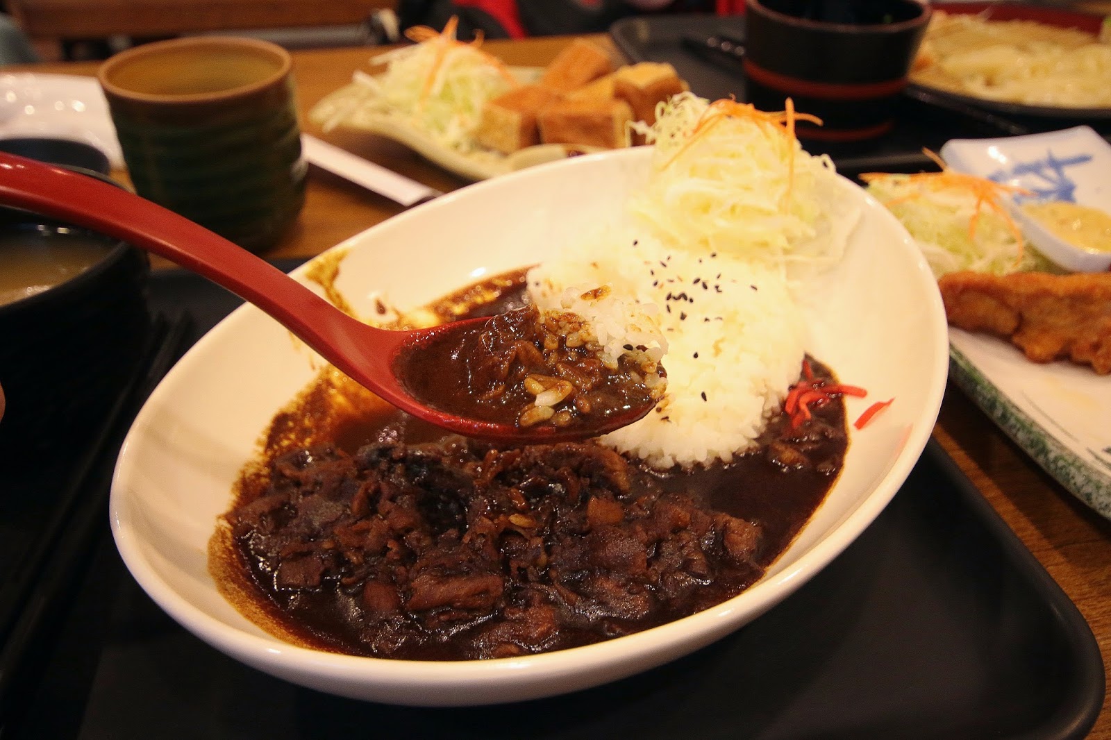 餐點有附一碗味噌湯,咖哩顏色頗深但還不至於到黑啦,