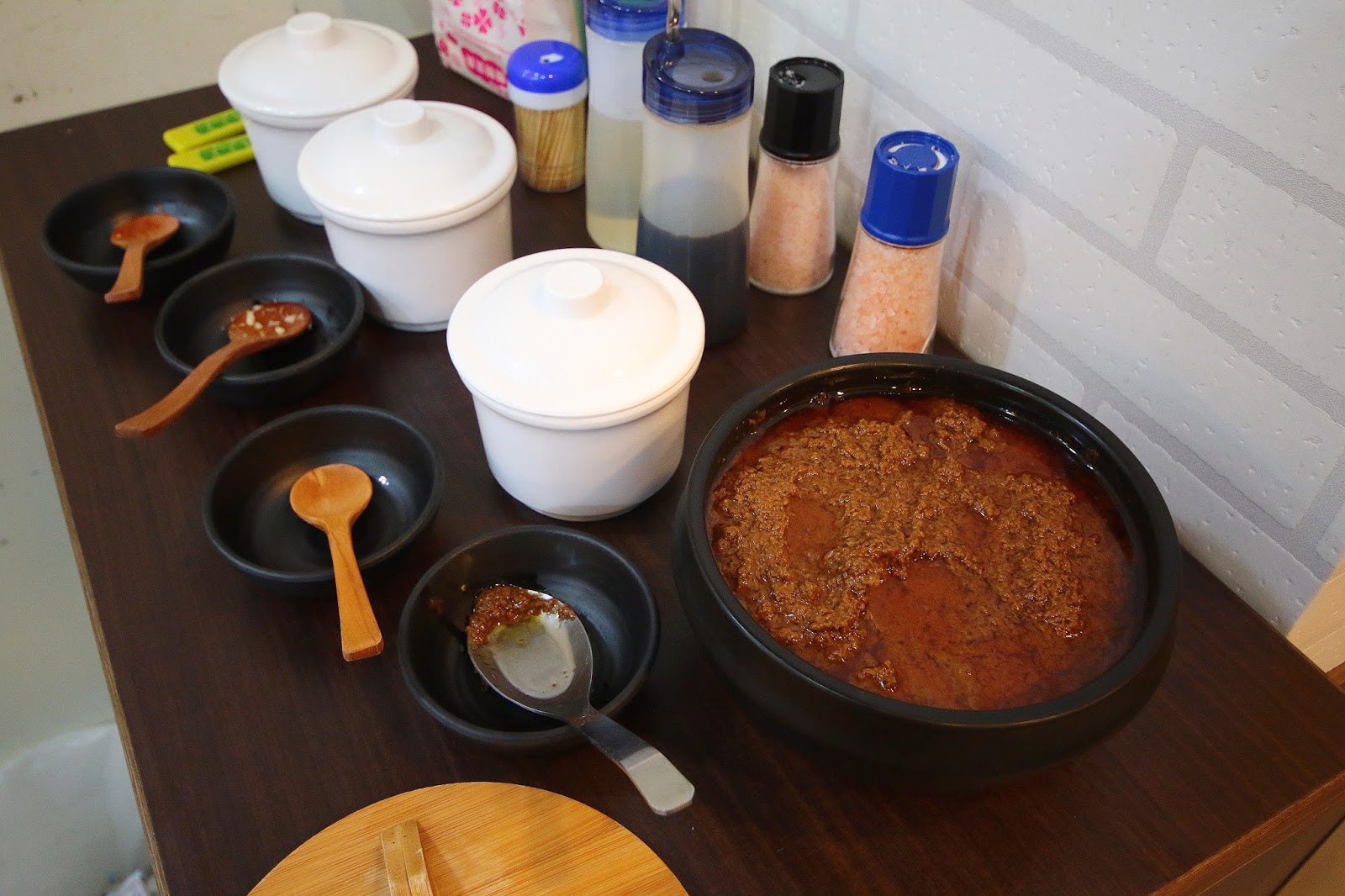 旁邊3個罐子裡裝的是蔥、蒜、辣椒,最重要的自製沙茶醬跟台南某派流很像,屬花生粉比較多且口味明顯的,咀嚼時還能嚐到些許顆粒感,