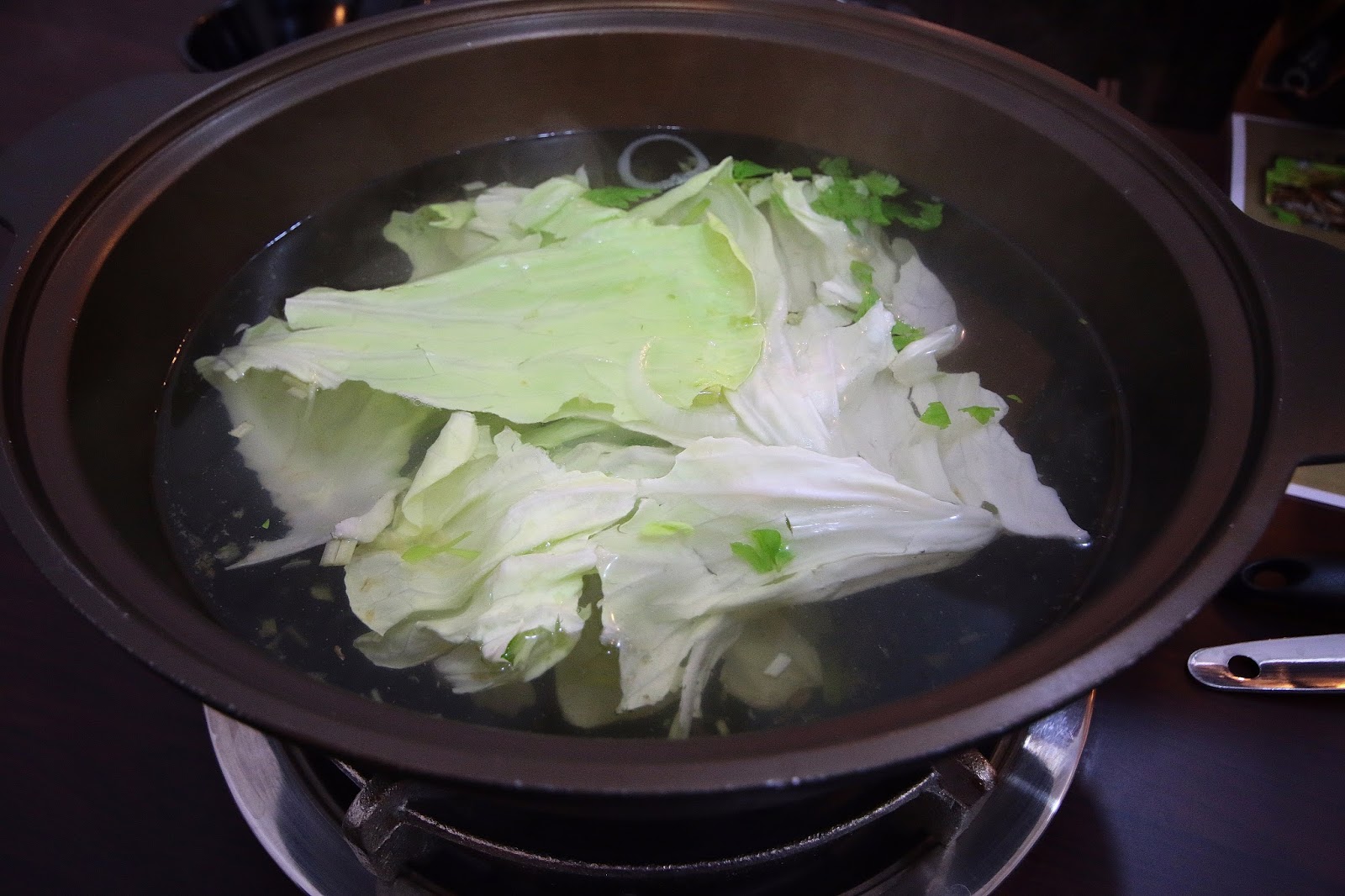 湯底清澈口味甘甜,還有幾片高麗菜、洋蔥、香菜,