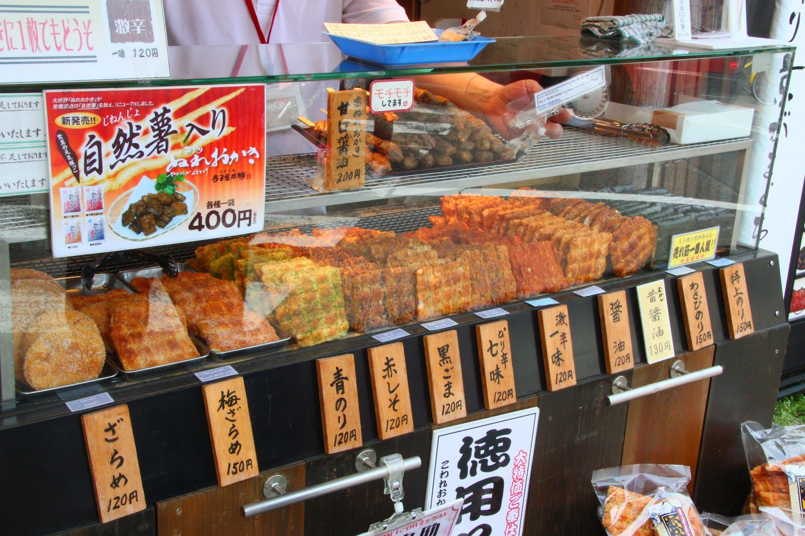 筆者自己很愛吃日本的零食、甜點類尤其是路邊攤,像在日本看到賣現烤仙貝的小攤差點忍不住全部口味都買一種(仙貝很香很硬),