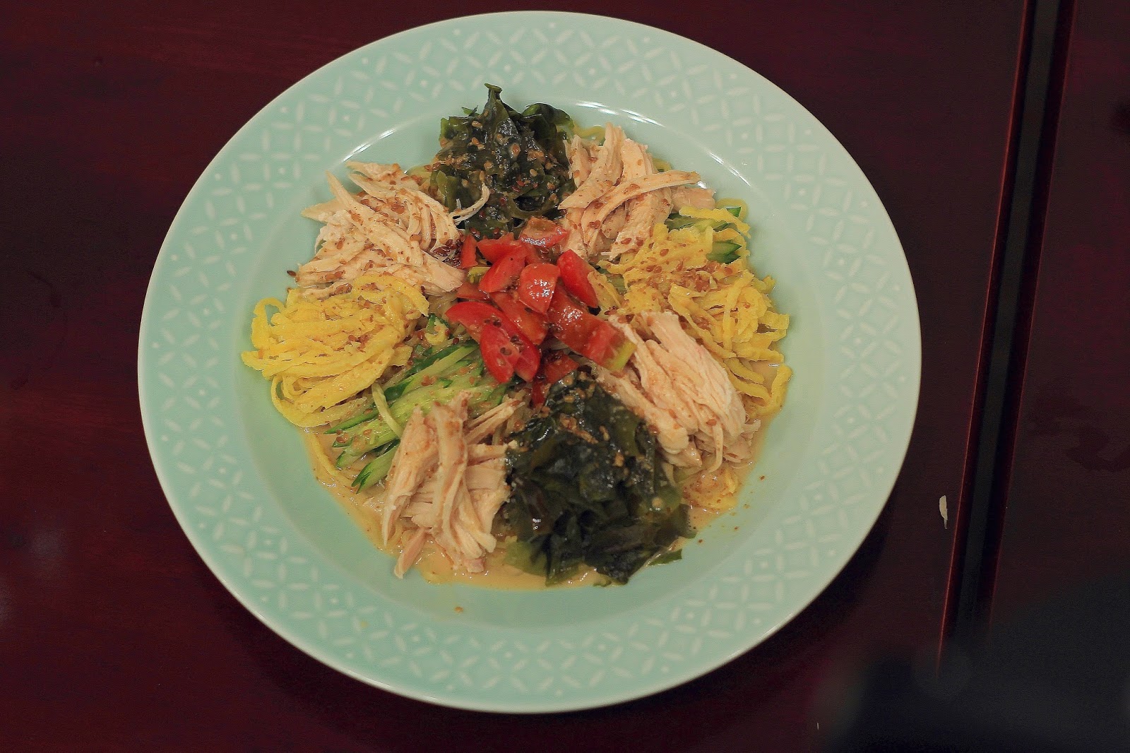 海帶芽、小黃瓜絲、錦系卵(甜甜的蛋絲)、柔嫩的手撕雞胸肉,切塊的鮮甜聖女小番茄,最後淋上滿滿日式芝麻醬調味,