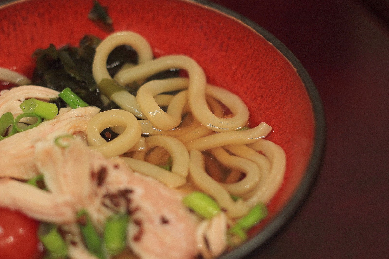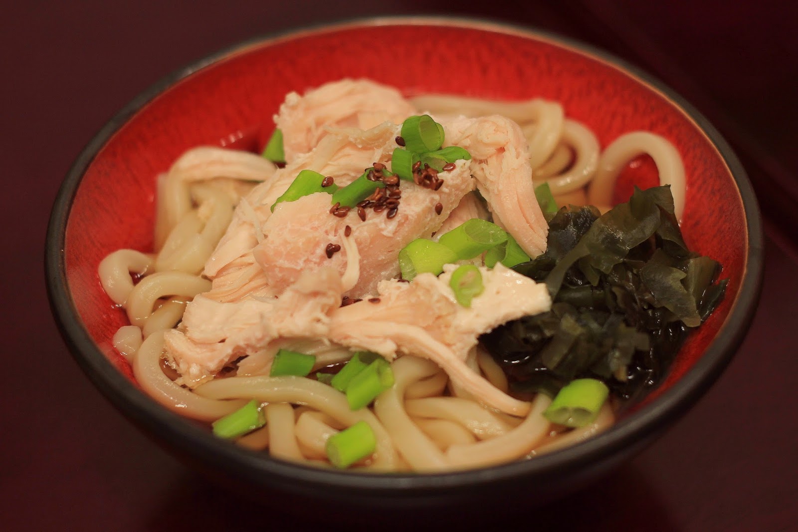 冰涼的烏龍麵浸泡在柴魚醬油中,配菜有海帶芽與柔嫩的水煮雞胸肉,