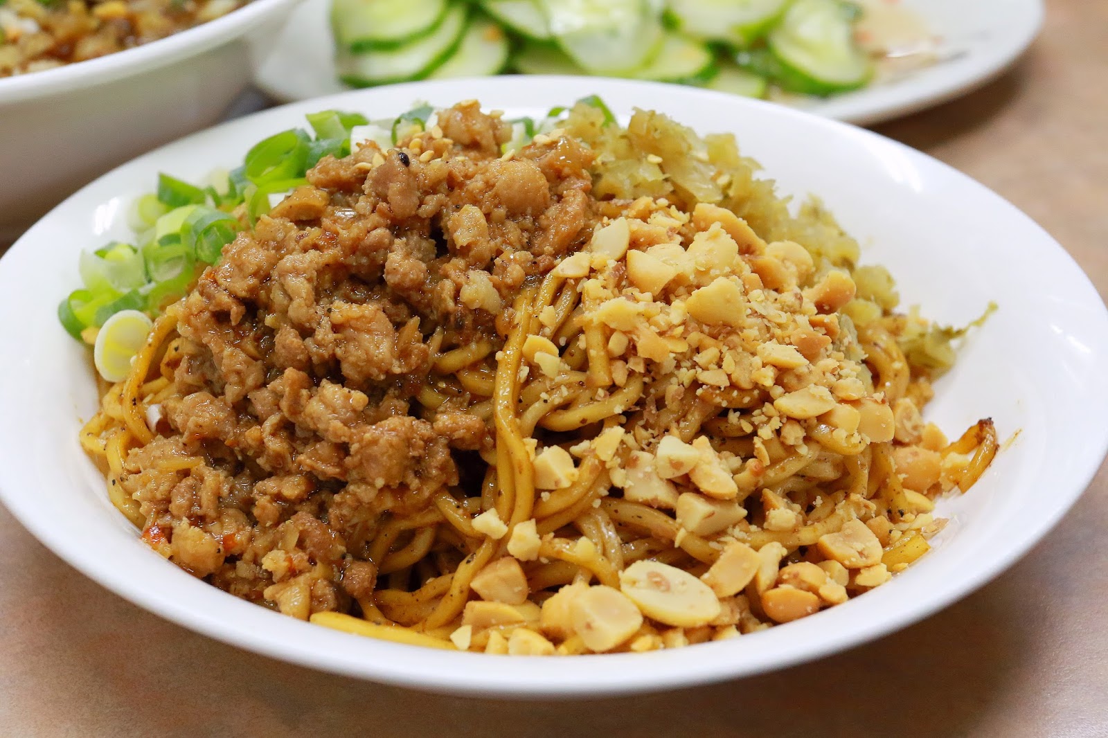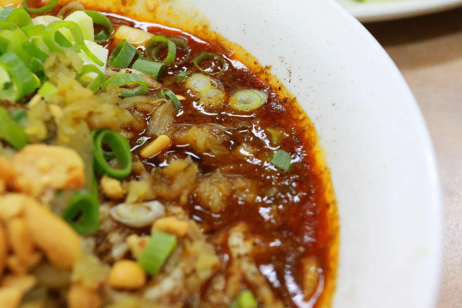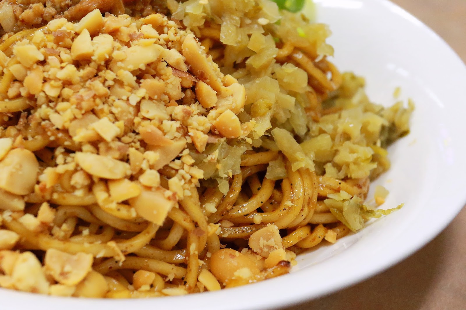 這碗是乾麵而且是真的很乾爽的那種乾,配料有花生、蔥花、酸菜、肉燥,一樣均勻拌開後就可以開動了,