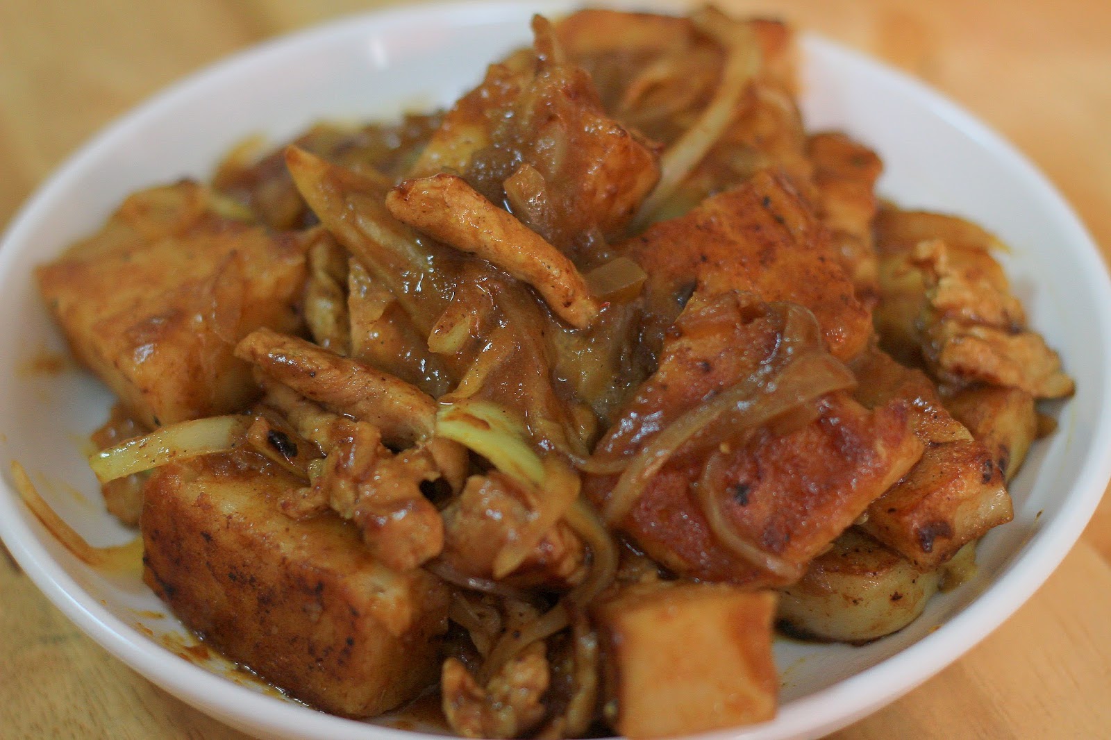 日式咖哩裡有拌炒過的洋蔥與豬肉絲,其實煎粿配咖哩這種組合自己在家翻冰箱找食材煮的時候也嘗試過,咖哩醬濃厚的口味緊緊裹滿煎粿,每口都充滿咖哩味,不過粿的米香就不凸顯了,畢竟這咖哩的比例接近我們一搬吃的咖哩飯而不是沾醬,