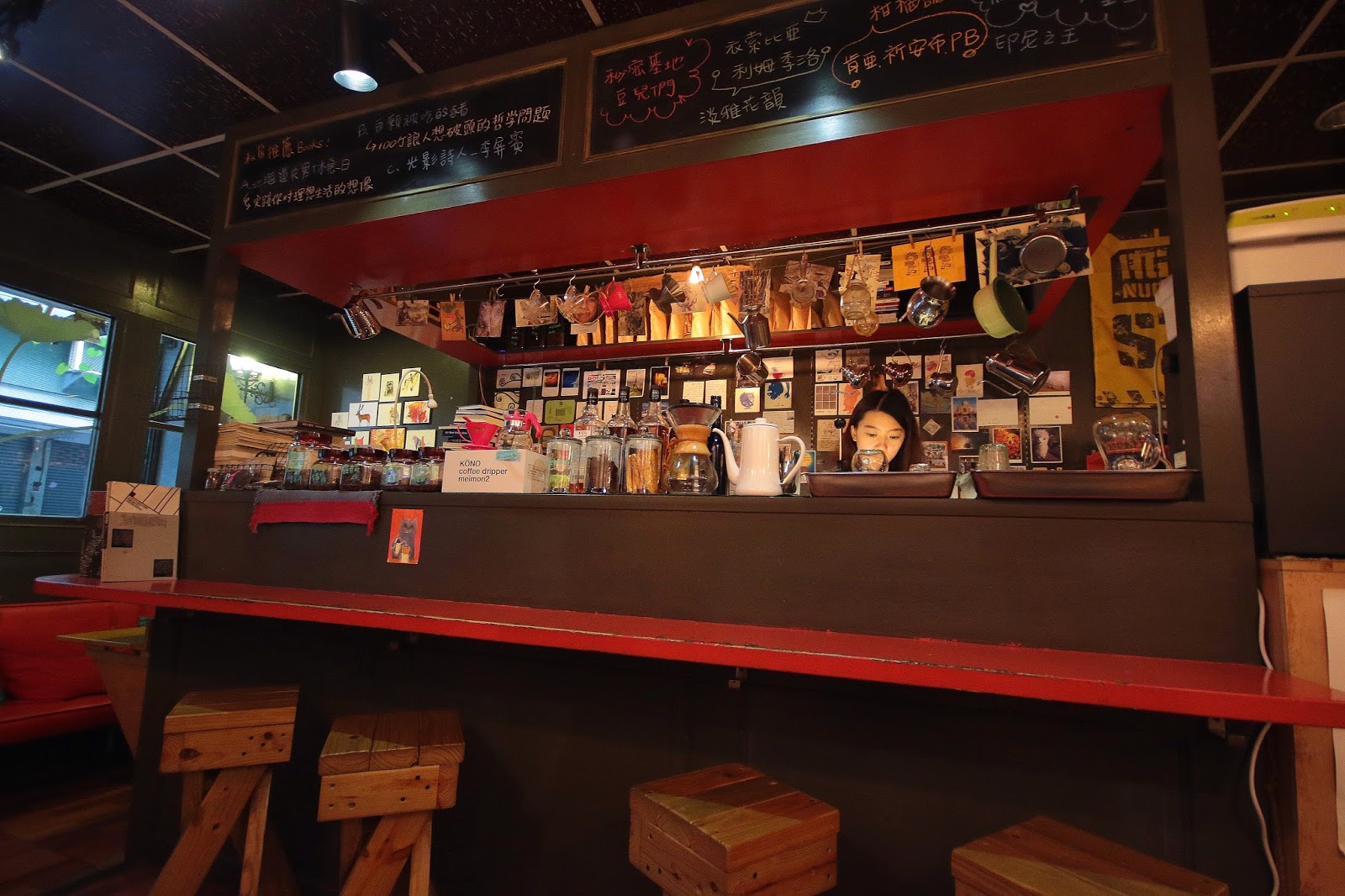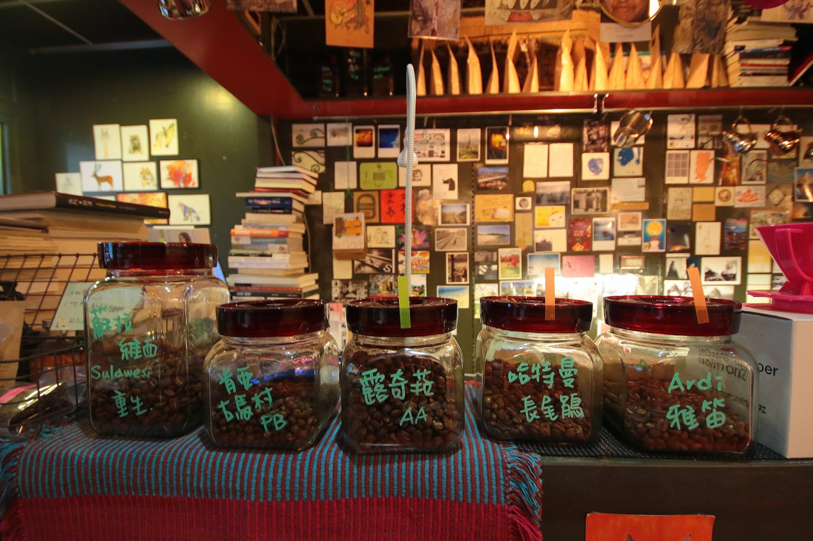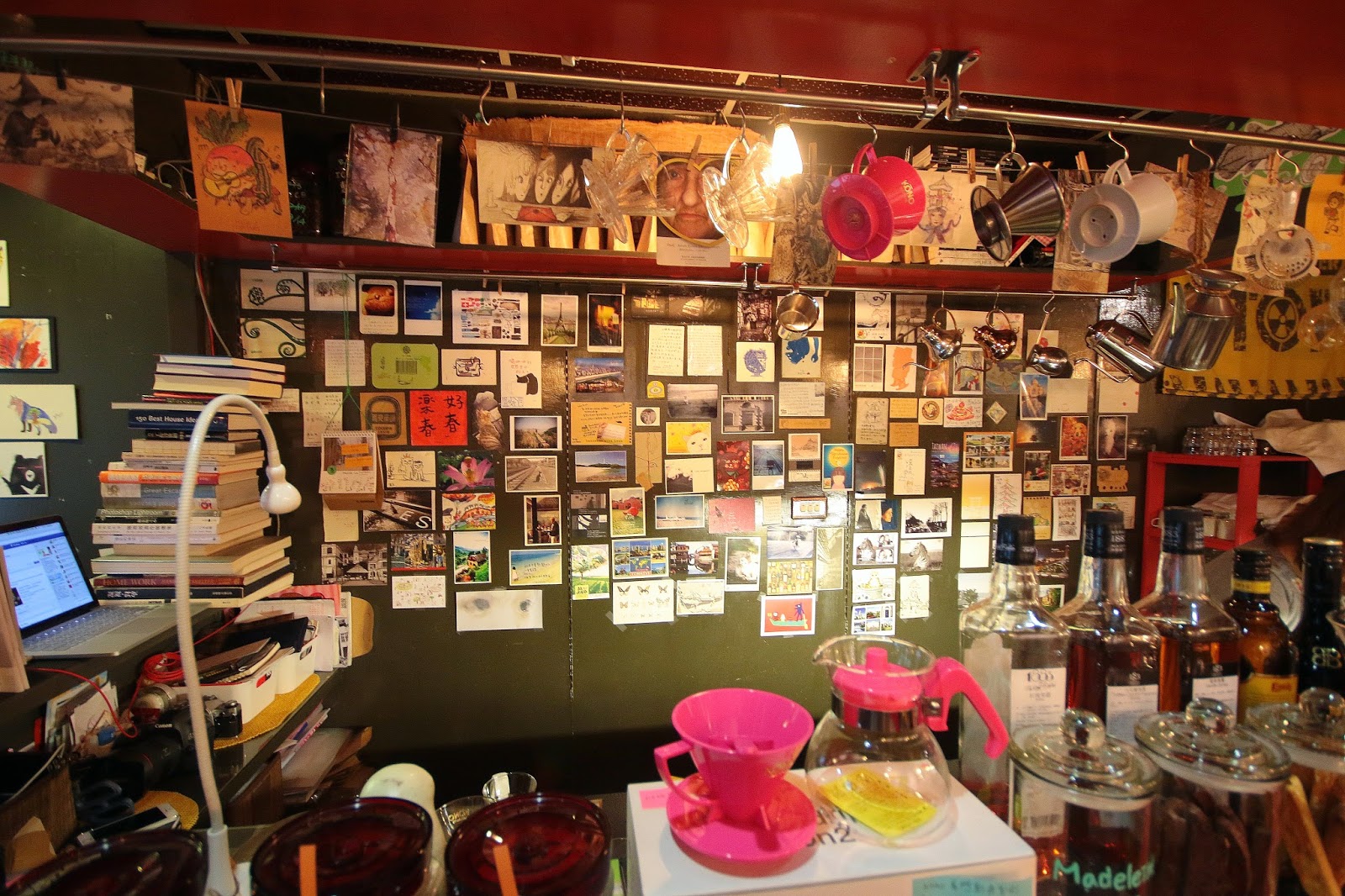 吧檯後有面貼滿明信片的牆,
