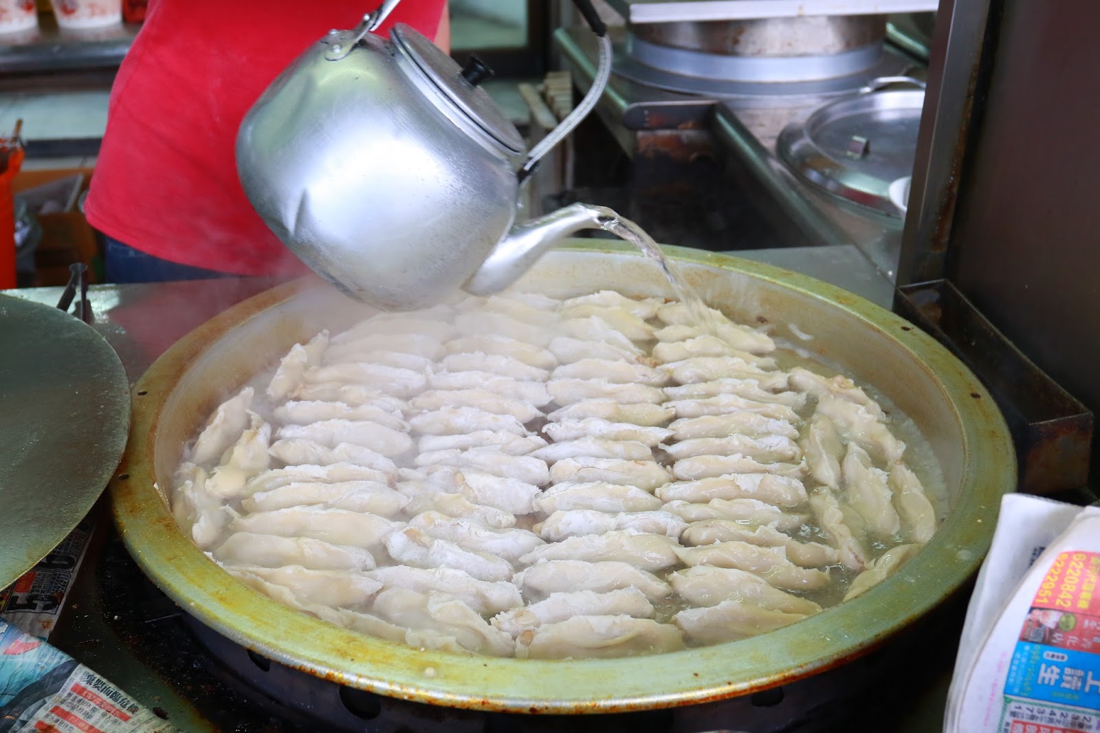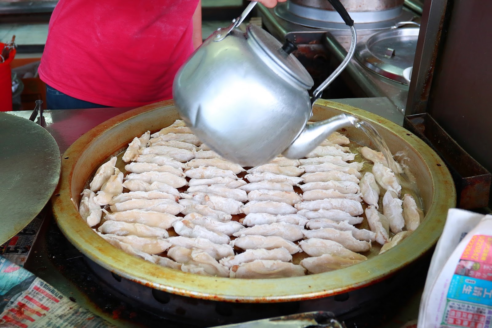 煎鍋擺滿包好的生鍋貼後就倒水,