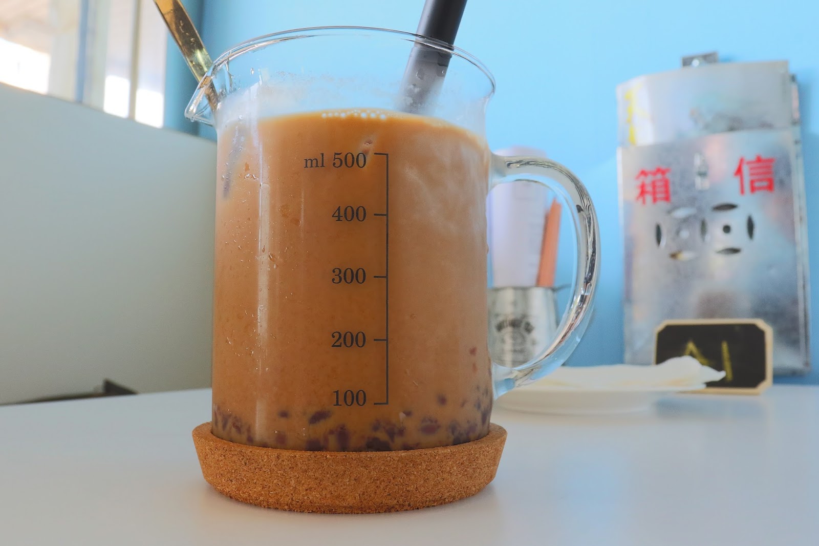 跟一般紅豆奶茶不一樣,把珍珠奶茶的珍珠換成紅豆粒的概念,港式奶茶風味不會很甜,