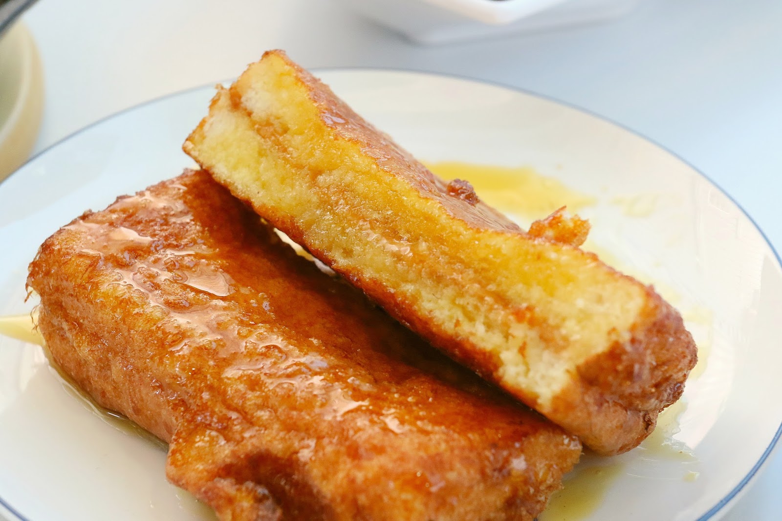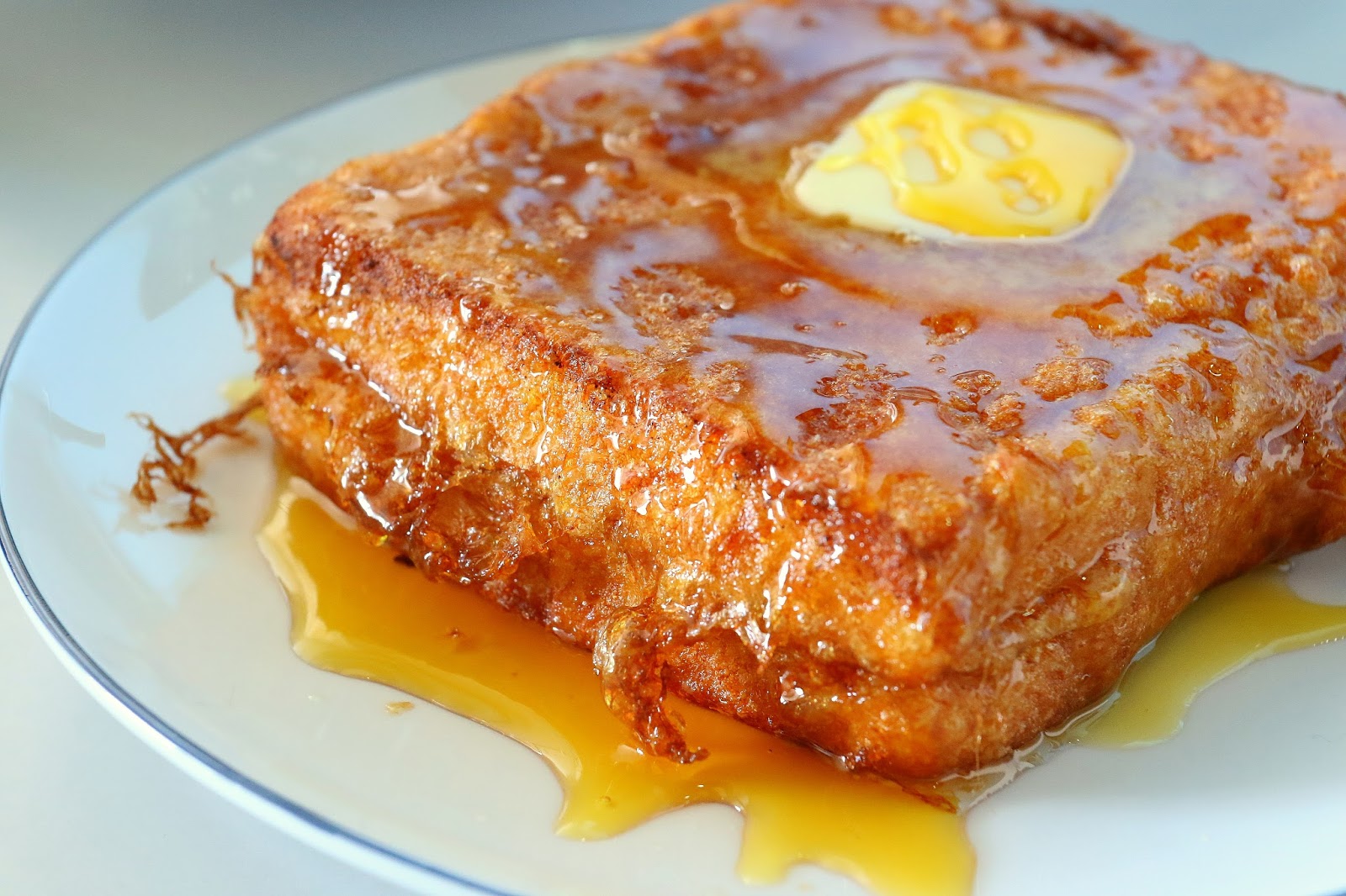 吐司外層裹了蛋液後煎的超焦香誘人的,再搭配滿滿的糖漿與一塊溶化中奶油,