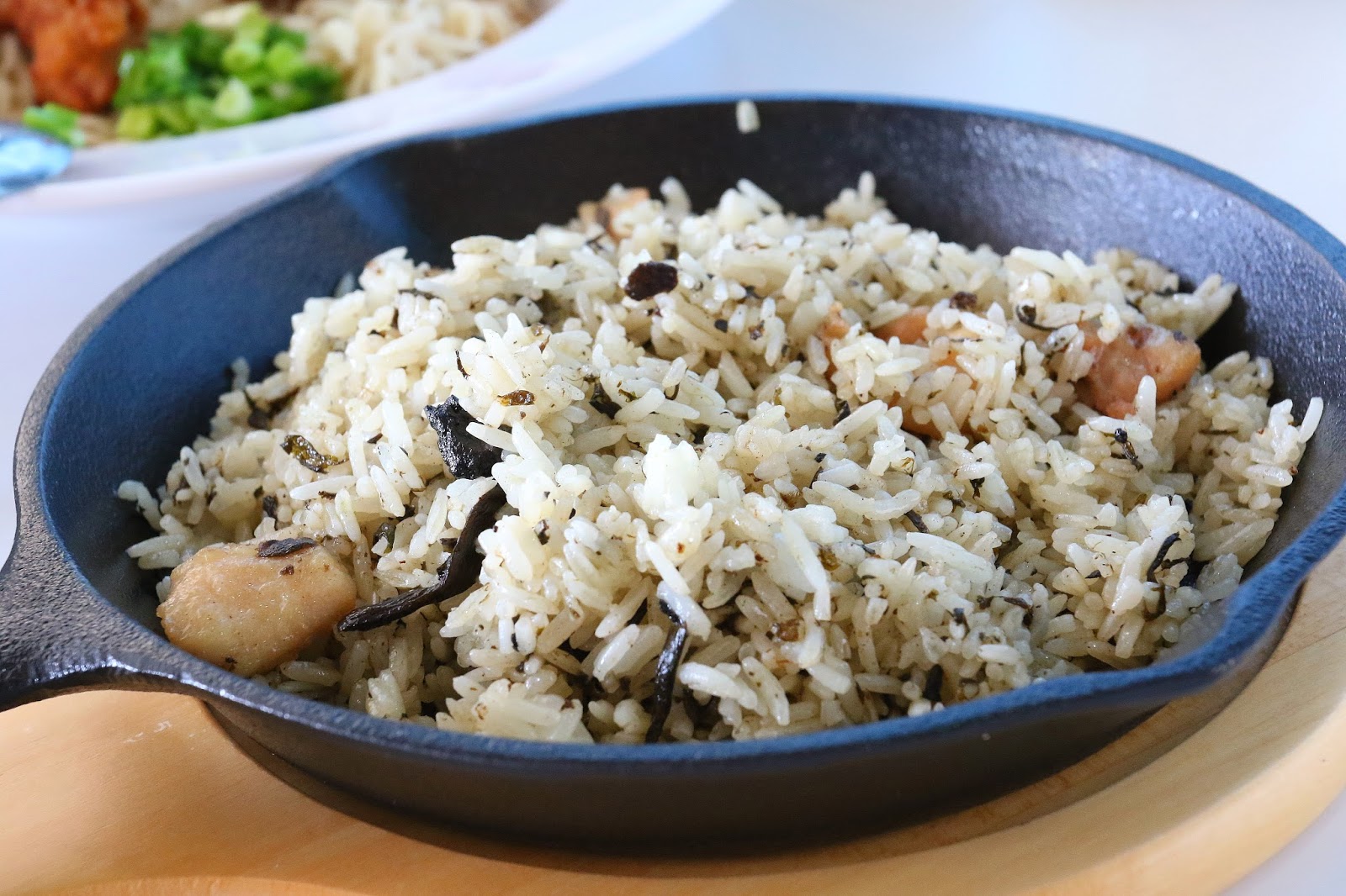 炒飯使用泰國長米所以口感粒粒分明,炒飯中黑色的顆粒是潮州菜中的欖菜(醃漬芥蘭菜),口味上類似台灣的梅干菜不過味道比較淡一點,